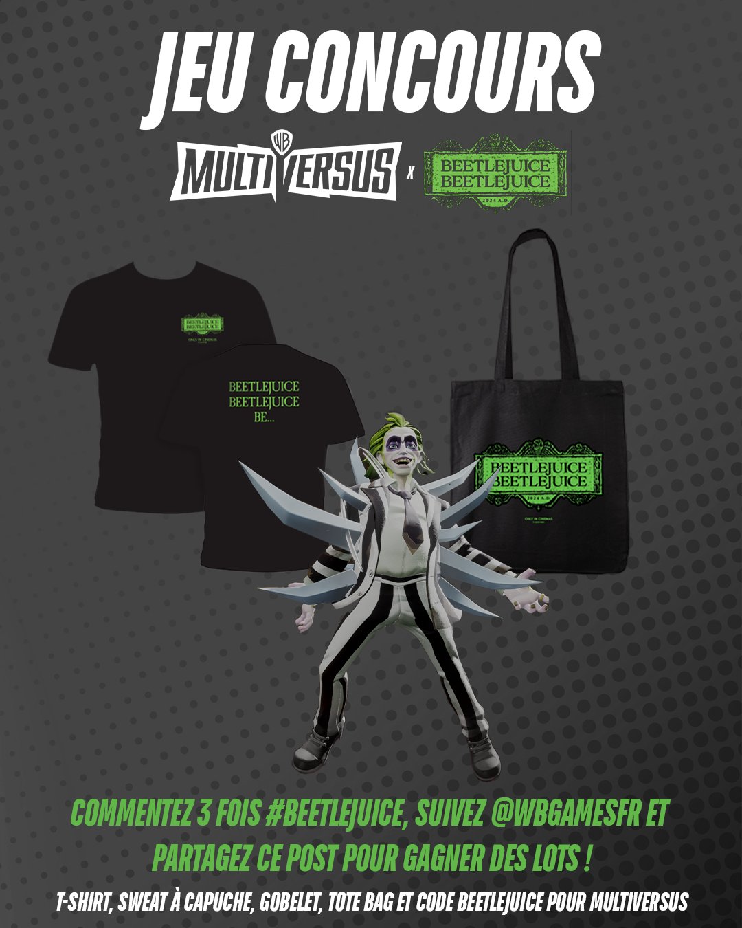 💚 JEU CONCOURS 💜 Beetlejuice fête son arrivée dans #MultiVersus en vous faisant gagner plein de cadeaux ! Retrouvez également Beetlejuice dans Beetlejuice Beetlejuice, au cinéma le 11 septembre. Pour participer : 💬 Commentez #Beetlejuice trois fois ! 👉 Suivez