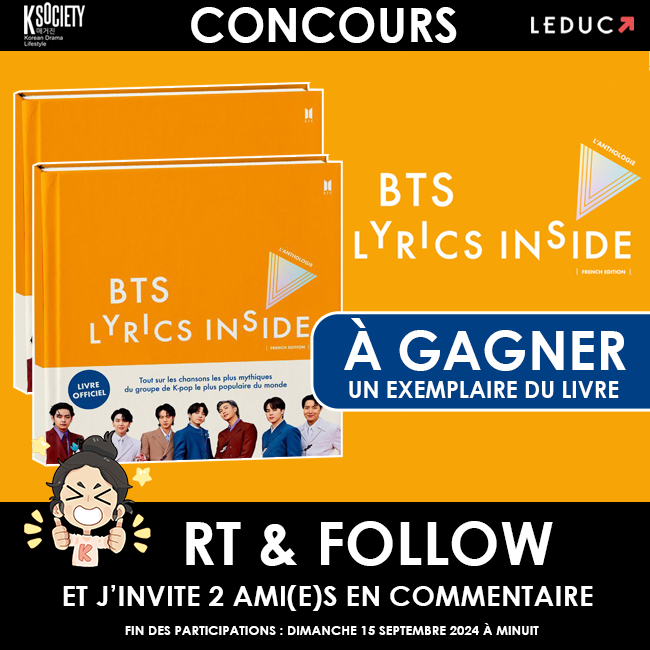 #CONCOURS - À GAGNER un exemplaire du livre #BTS LYRICS INSIDE 🎁 disponible chez @editionsleduc ⭐️Pour participer c’est simple : RT & FOLLOW @ksociety_mag et @editionsleduc J’invite 2 ami(e)s en commentaire. Fin des participations le 15/09/24 à 23:59 ⭐️https://t.co/XVnPD7BBmb