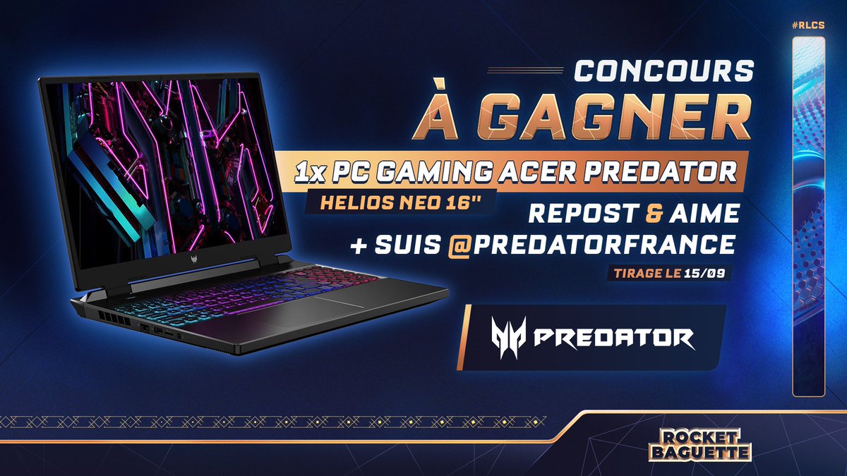 🎁 #CONCOURS A l'occasion des Worlds #RLCS 2024, on vous régale avec Acer Predator ! À gagner un PC gaming HELIOS NEO 16" d'une valeur de 1.799€* ! Deux conditions** pour participer : - Republier 🔁 & aimer ❤️ ce post - Suivre @PredatorFrance Tirage au sort le 15/09.