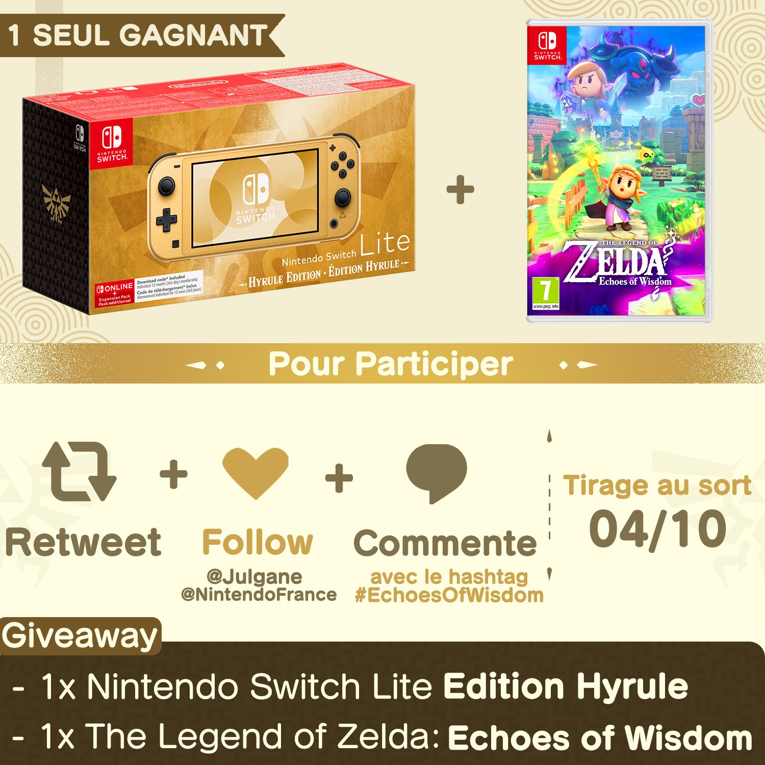 🎁 CONCOURS 🎁 Pour fêter la sortie de The Legend of Zelda: Echoes of Wisdom, on vous fait gagner une Nintendo Switch Lite Édition Hyrule et un exemplaire du jeu !✨ ► RT + FOLLOW @Julgane & @NintendoFrance ► Commente avec le hashtag #EchoesOfWisdom 1 Gagnant tiré au sort le