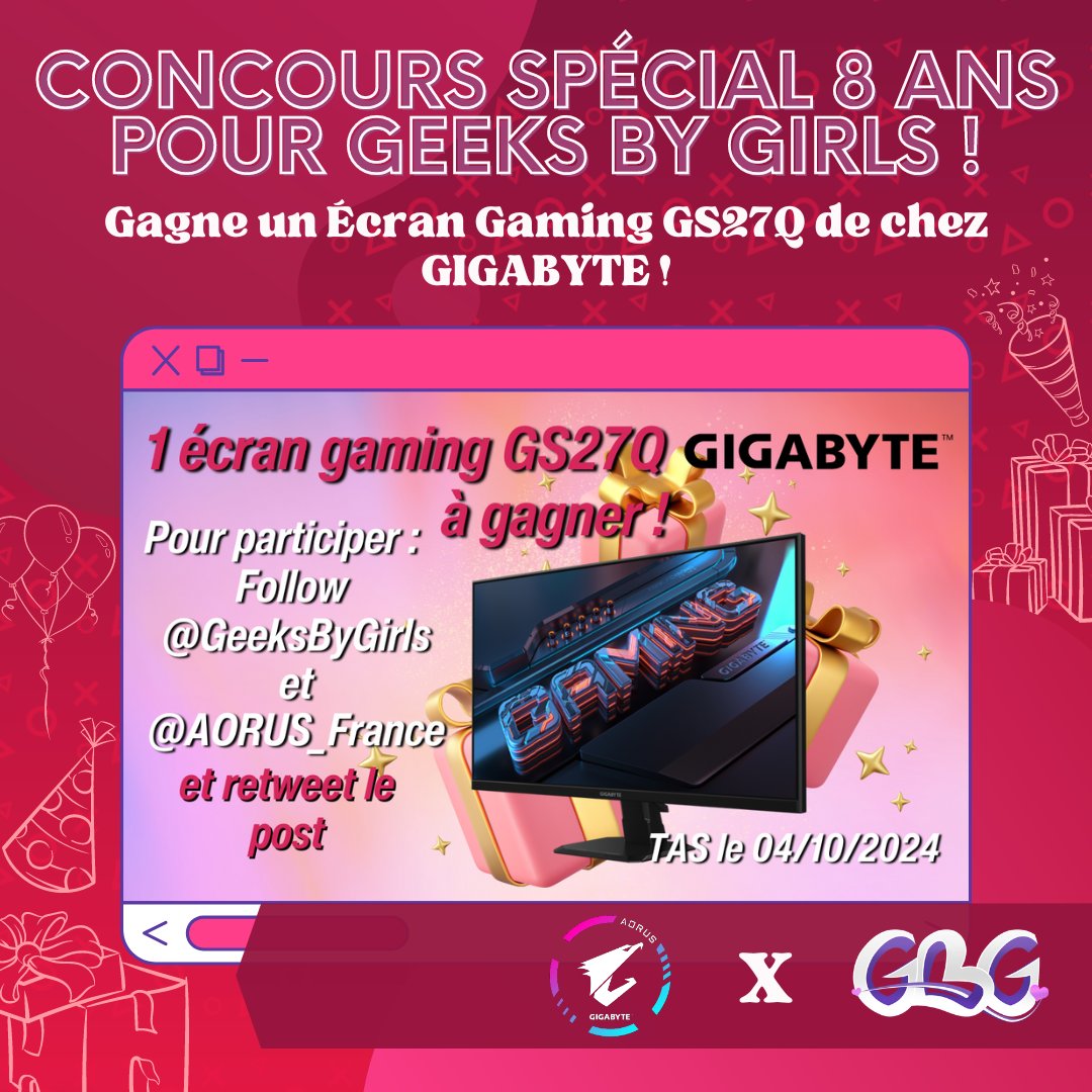 📢 #CONCOURS 8 ans #GeeksByGirls ! 📢 🔃 RT ✅ Follow @GeeksByGirls & @AORUS_France 🍀 TAS le 04/10/2024 ❤#Giveaway #Gaming #PCgaming #TeamUpFightOn #JeuxVideo #AORUS #GBG 🎁 Gagne un #Ecran Gaming GS27Q de chez #GIGABYTE !