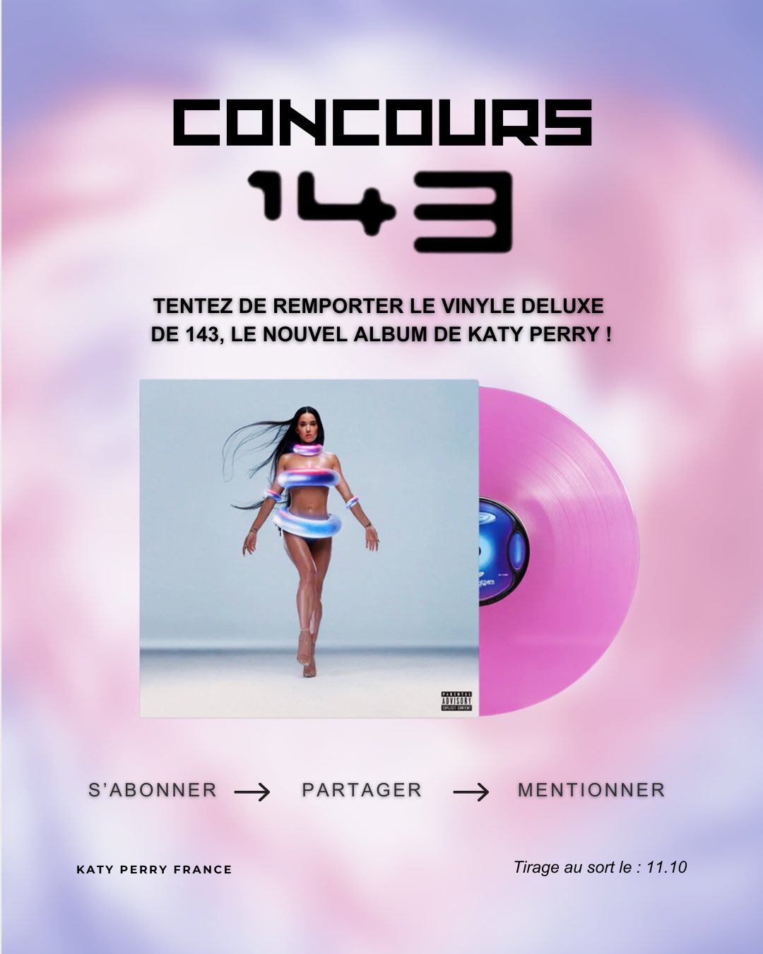 #CONCOURS Tentez de remporter le vinyle deluxe de 143 de @katyperry !✨ Pour participer : 🔁 RT ce tweet 👉🏻 FOLLOW @KatyPerryFrance 💬 Mentionne un.e ami.e avec #KatyPerry143FR ⚠️ Réservé à la France 🔔 TaS: le 11.10 à 19H