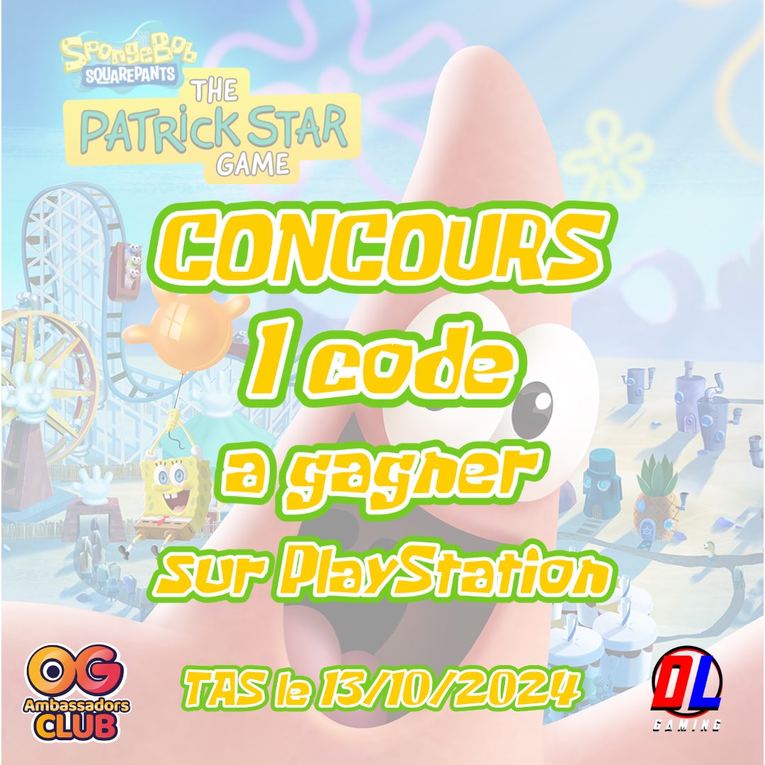 🫧 Concours Bob l’Éponge 🫧 1 code à gagner sur PlayStation 𝗣𝗼𝘂𝗿 𝗽𝗮𝗿𝘁𝗶𝗰𝗶𝗽𝗲𝗿 : 🫧 Suivre @DLGAMING22 & @Outright_Games 🫧 Tag 1 amis avec le #ThePatrickStarGame 🫧 Like & RT 🫧 TAS : 13/10/24 Bonne Chance à tous 😘 #CONCOURS #PlayStation #SpongBob