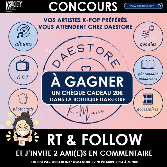 #CONCOURS - À GAGNER un chèque-cadeau de 20 Euros 🎁 à utiliser dans la boutique @Daestore_Lyon ⭐️Pour participer c’est simple : RT & FOLLOW @ksociety_mag et @Daestore_Lyon J’invite 2 ami(e)s en commentaire Fin des participations le 17 novembre 2024 à 23:59