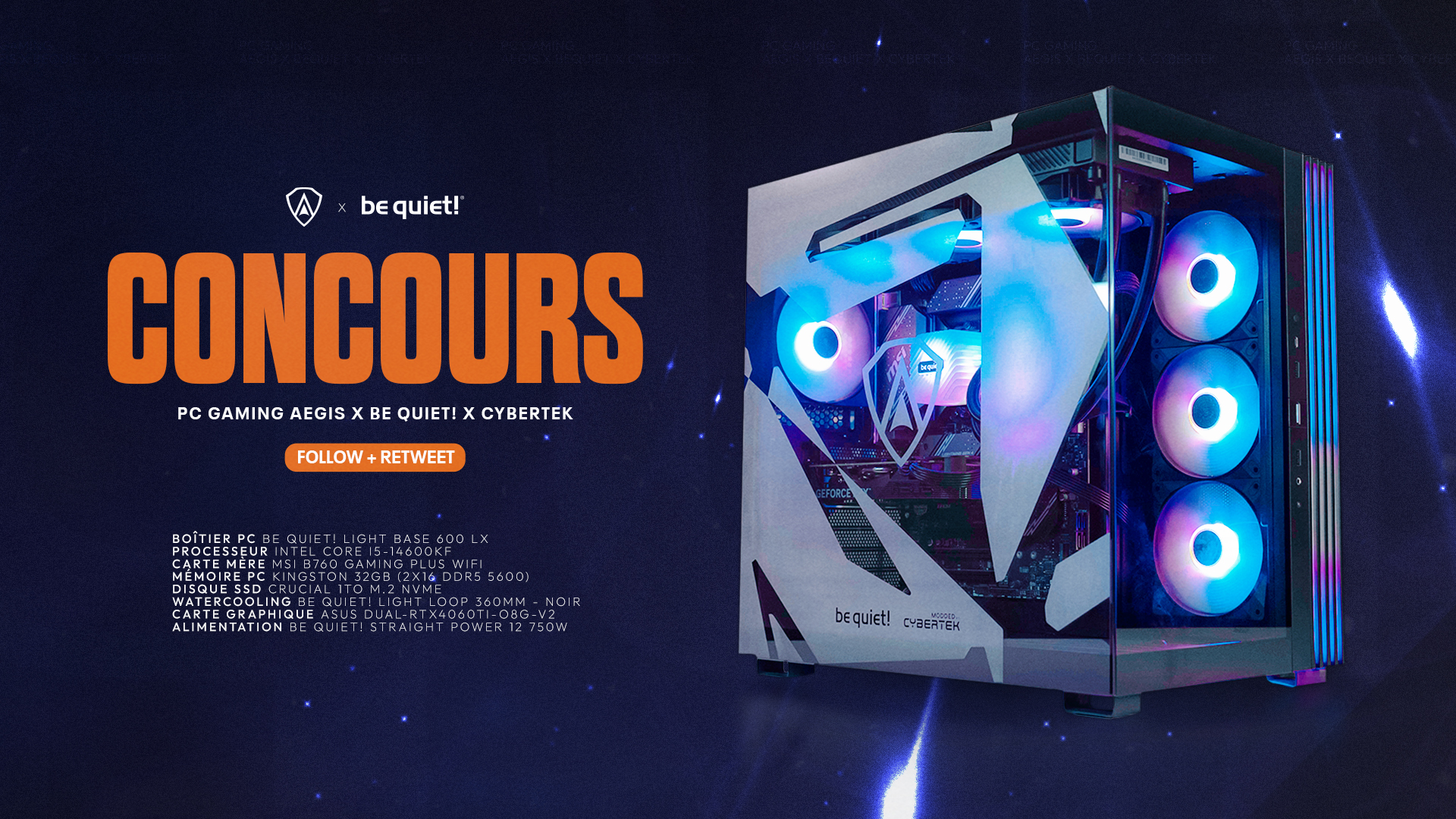 Avec nos partenaires be quiet! et Cybertek, on a mis les petits plats dans les grands, pour vous faire gagner un lot d'exception ! Nous mettons en jeu ... un PC brandé AEGIS, d'une valeur de 1599€ ! Pour participer : follow @Team_Aegis_, @cybertek_fr & @bequietFR, et RT ce