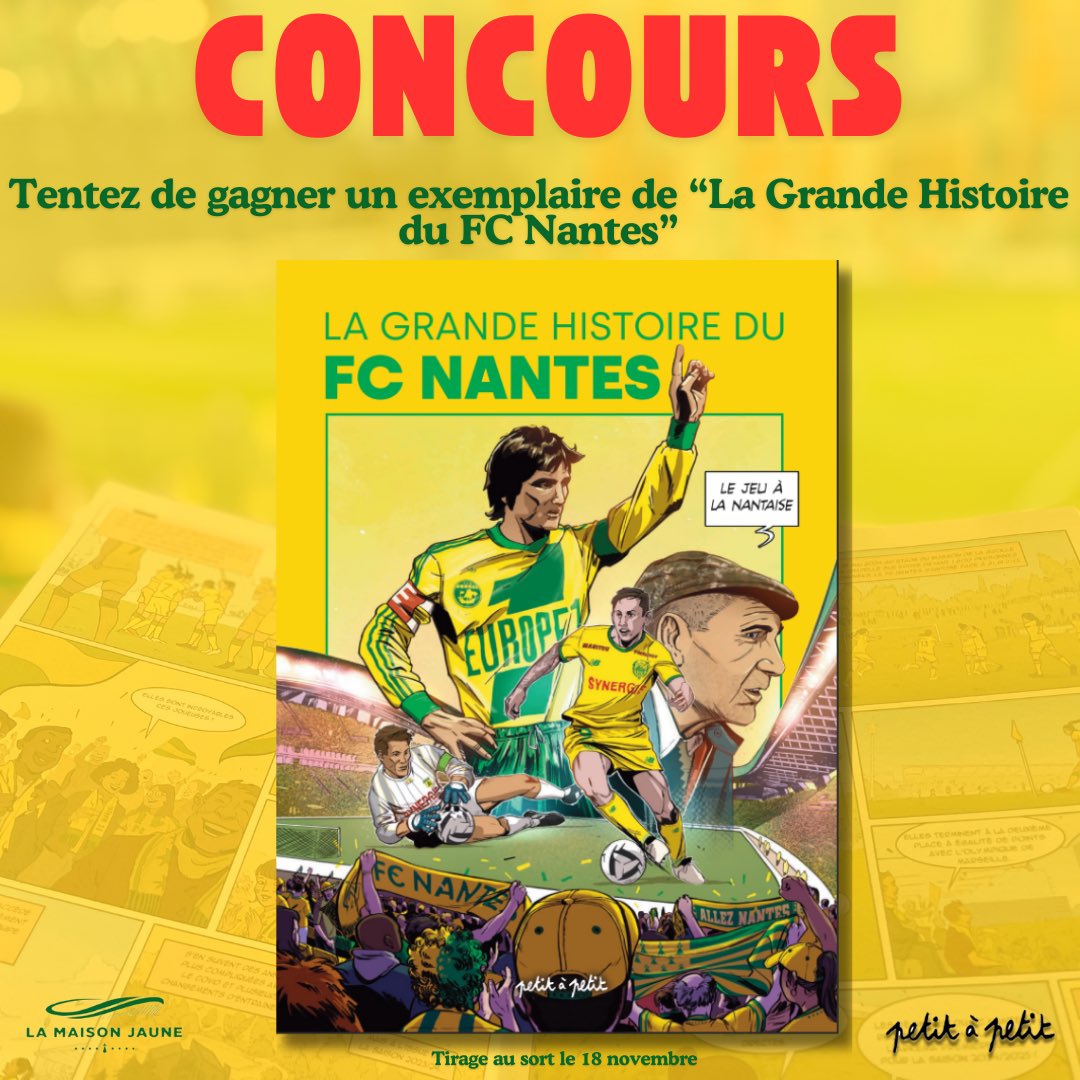 📖 La Maison Jaune et les éditions Petit-à-Petit vous font gagner le docu-BD "La grande histoire du FC Nantes" Pour participer : ▪️ Suivre les comptes @PETITAPETIT__ et @La_MaisonJaune ▪️ Liker et RT le présent post Tirage au sort le 18/11/2024 #docubdfcnantes #Concours