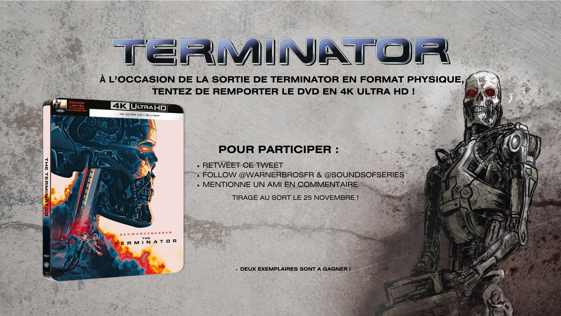 #CONCOURS : A l'occasion de la sortie de 'Terminator' en format physique le 20 novembre, tentez de remporter le DVD en 4K Ultra HD ! POUR PARTICIPER : - Retweet ce tweet. - Follow @warnerbrosfr & @SoundsOfSeries - Mentionne un ami en commentaire TIRAGE AU SORT : 25/11