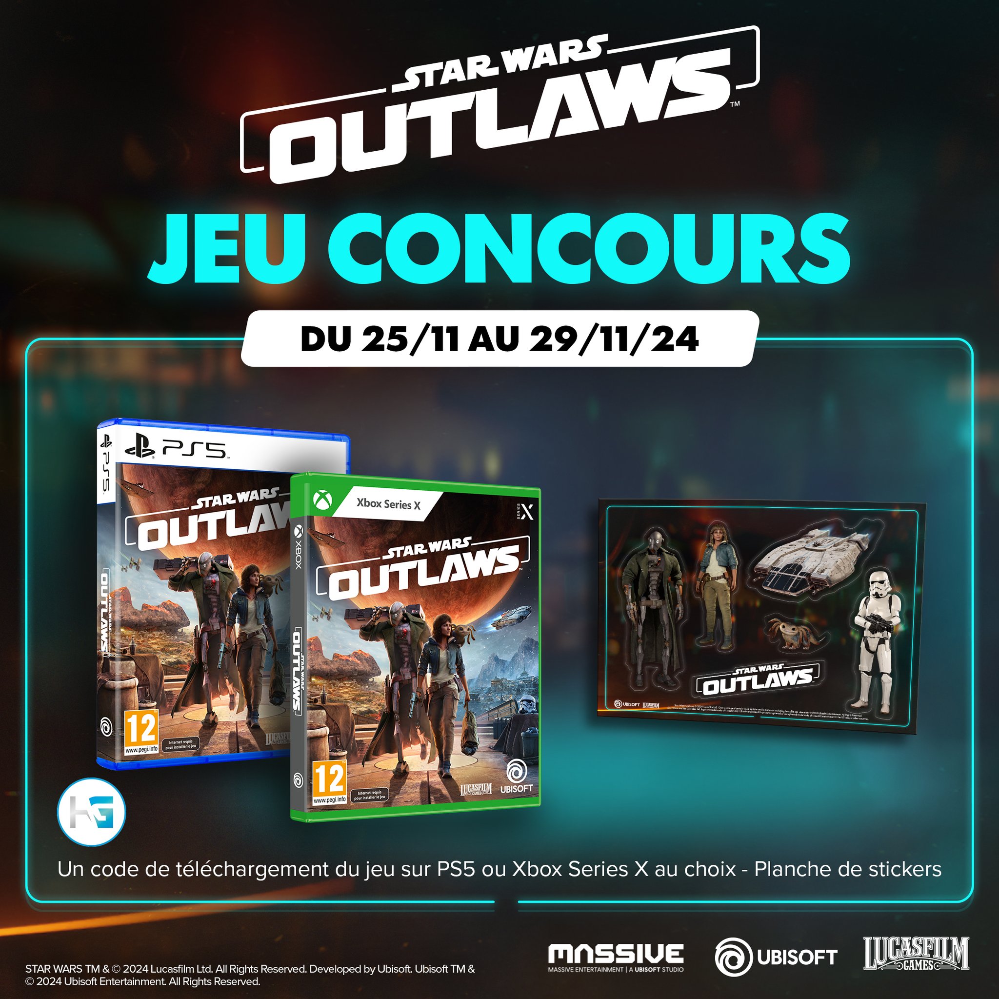 #CONCOURS Tentez de remporter le jeu Star Wars Outlaws et explorer la galaxie aux cotés de Kay Vess et Nix ! Pour participer : ➡️RT + Suivez @hypergamesA et @UbisoftFR ➡️Aimez + commentez avec #StarWarsOutlaws TAS LE 29/11. 2 gagnant(e)s. Règlement : https://t.co/xu87jTxvGF