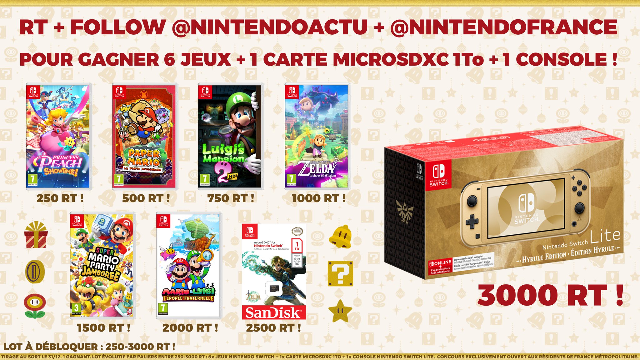 [CONCOURS] Tentez de gagner un pack Nintendo Switch de Noël : 1 console, 6 jeux et 1 carte SanDisk microSDXC 1To ! - RT + Follow @NintendoActu et @NintendoFrance - Tag un(e) ami(e) et dis à quel jeu tu veux jouer ! 3000 RT pour la console ! 🔥 🎁 1 gagnant ! Tirage le 31/12.
