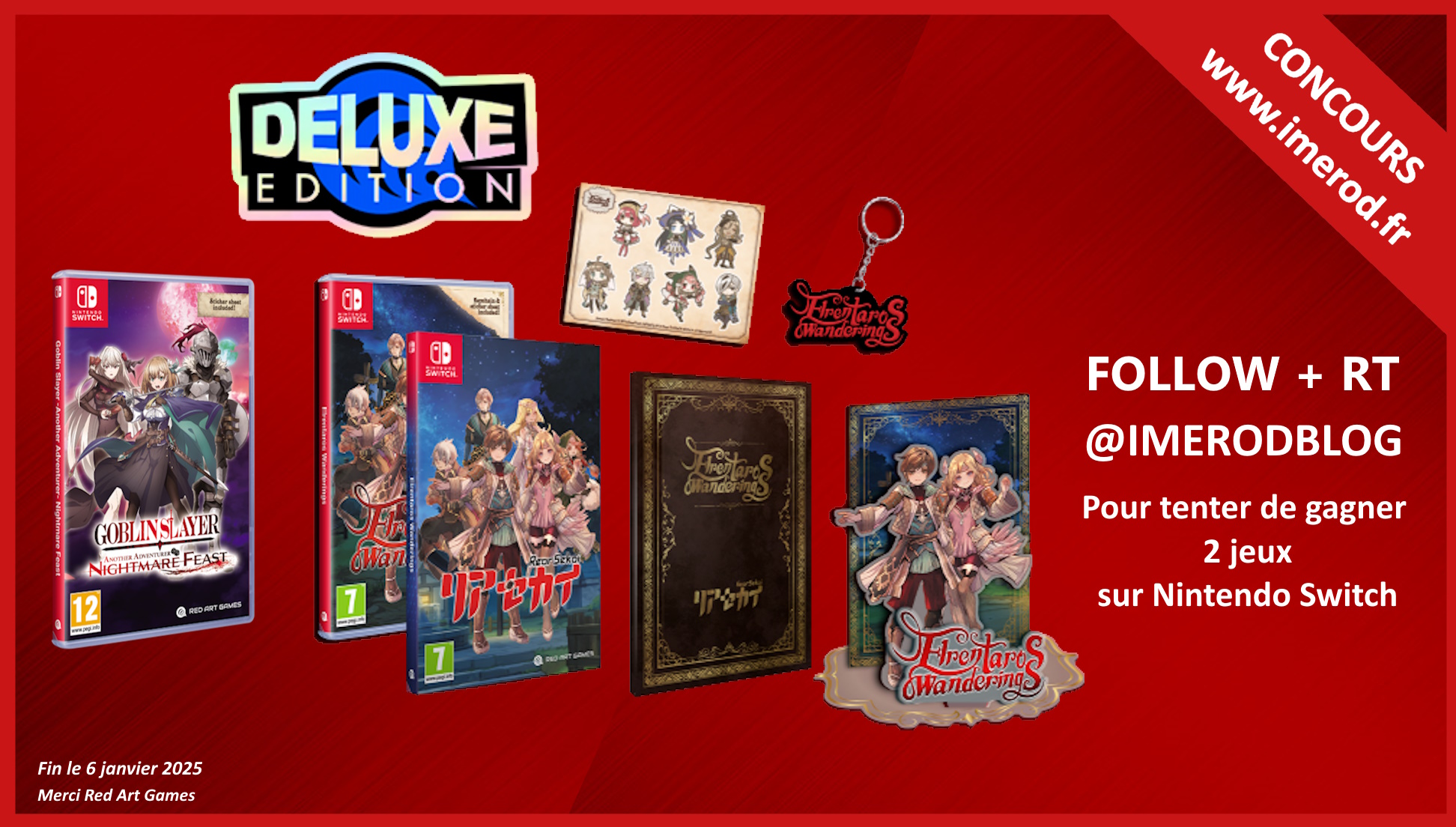 🎁CONCOURS 12ème anniversaire du blog 🎁 Avec @RedArtGames, on vous offre Goblin Slayer et Elrentaros Wanderings (version deluxe) sur Nintendo Switch, en physique ! Pour participer : - FOLLOW + RT @imerodBlog - Mentionne un pote en commentaire 🍀TAS le 06/01/2025
