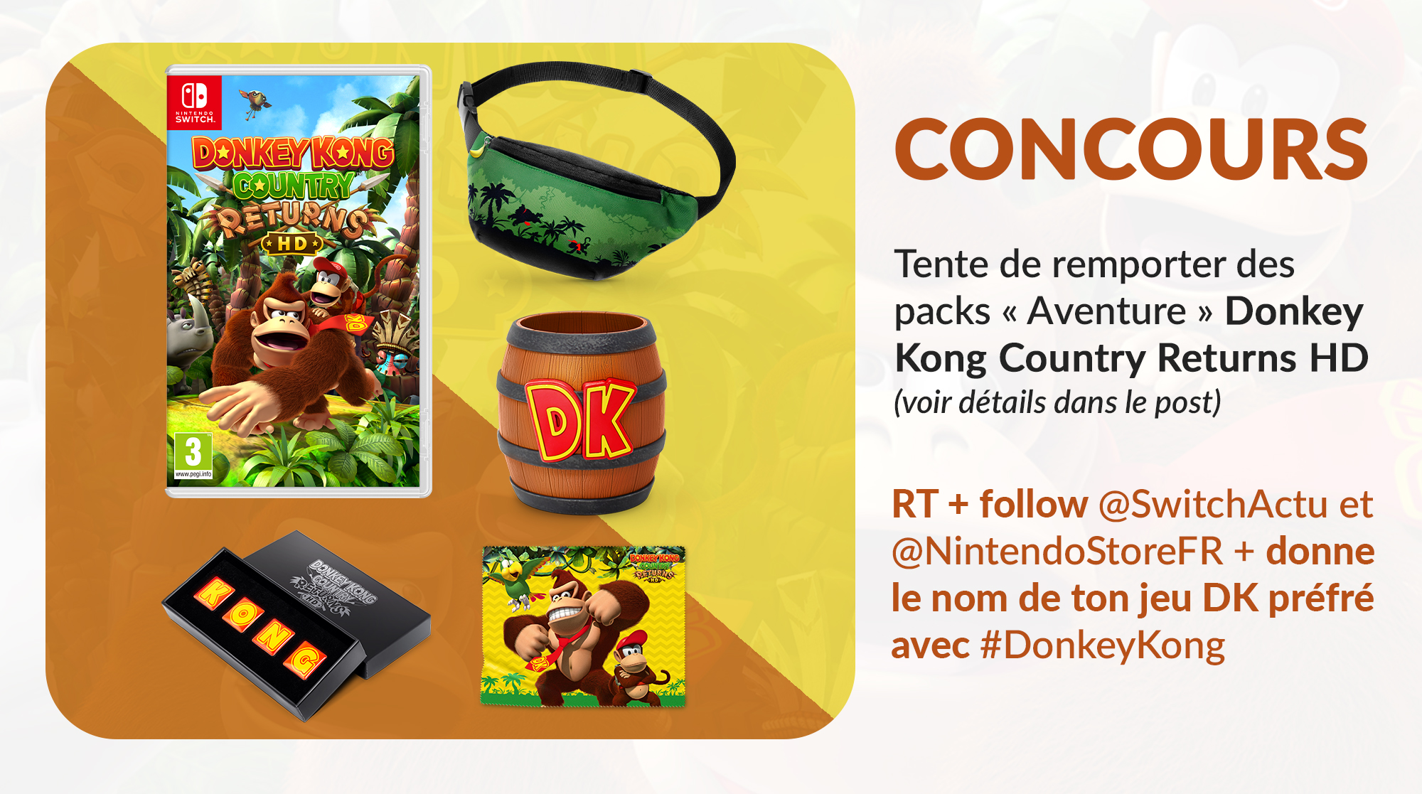 #CONCOURS - Tente de gagner des packs « Aventure » Donkey Kong Country Returns HD ! Pour participer : 🔁 RT ce tweet 👉 FOLLOW @SwitchActu et @NintendoStoreFR 💬 Dis-nous quel est ton jeu DK préféré avec #DonkeyKong Contenu des lots : ➡️ Le jeu ! ➡️ Un sac banane ➡️ Un