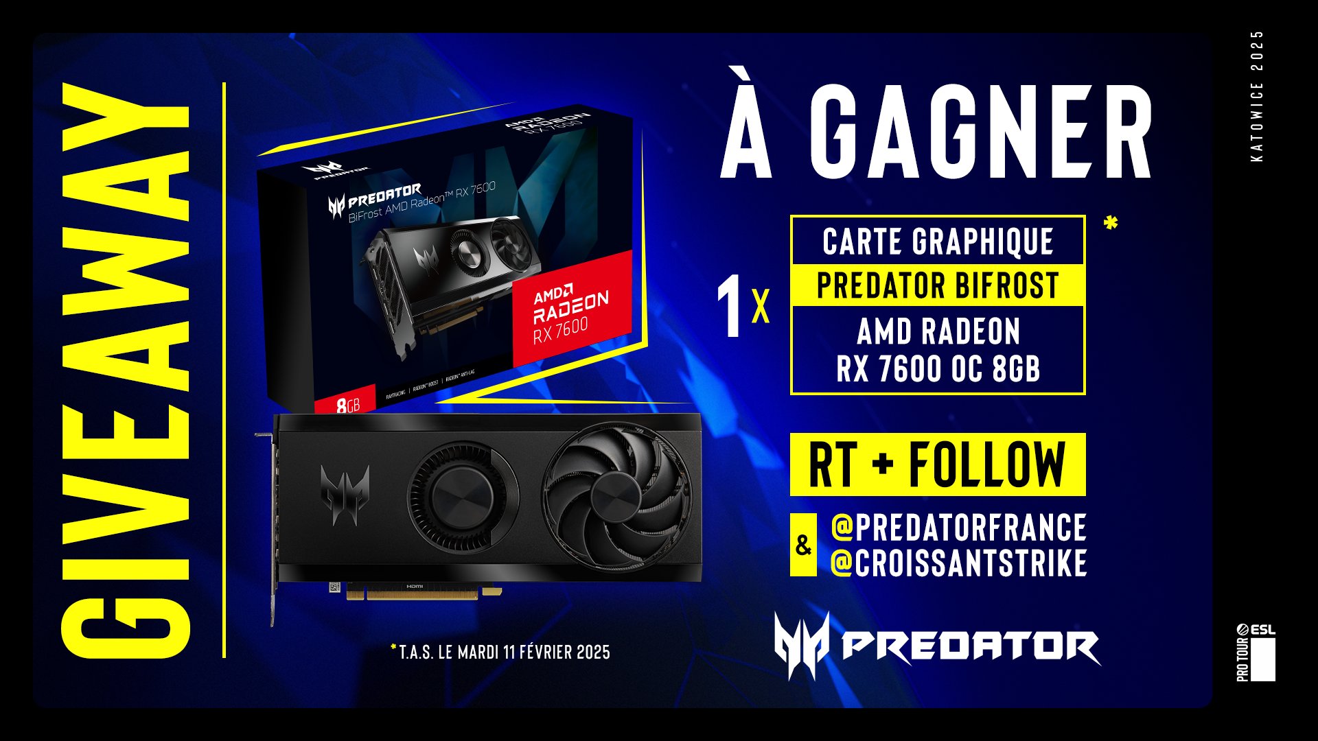 🎁 Nos amis de Predator vous offrent une carte graphique pour fêter la finale du tournoi ! ✅ Follow @PredatorFrance ✅ Follow @CroissantStrike ✅ Retweet ⏳ Tirage au sort Mardi 11 février #CollaborationCommerciale