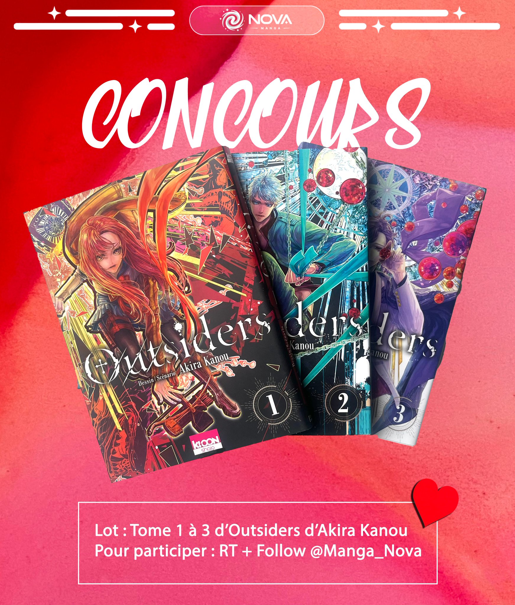 💌 CONCOURS 💌 Quoi de mieux pour fêter la Saint-Valentin que de vous offrir les 3 premiers tomes d'Outsiders ? Pour participer : RT + Follow @Manga_Nova Fin du concours le 21/02 😇 Bonne chance à tous 🍀