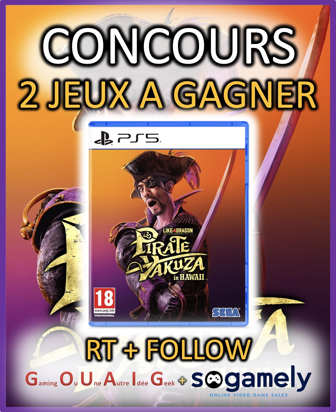 🎁 #CONCOURS 🎁 Gagne le jeu Like A Dragon Pirate Yakuza in Hawaii qui sort sur #PS5 2 gagnants ! Edition physique livrée chez toi 📦 ✅ RT/Like + follow @Sogamely_com ✅ Répond #SogamelyHawai Jeu dispo à 44,99€ avec le code HAWAI chez @Sogamely_com TAS dans 1 semaine