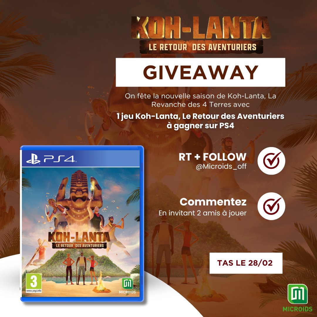 #GIVEAWAY 🌴 On fête le début de #KohLanta, La Revanche des 4 Terres sur @TF1 et @tf1plus en vous offrant 1 jeu Koh-Lanta, Le Retour des Aventures sur PS4 ! Pour participer : 🟢 RT + FOLLOW @Microids_off 🟠 Invitez 2 amis à jouer 🔵 Utilisez le hashtag #KohLanta 🟣 TAS le 28/02
