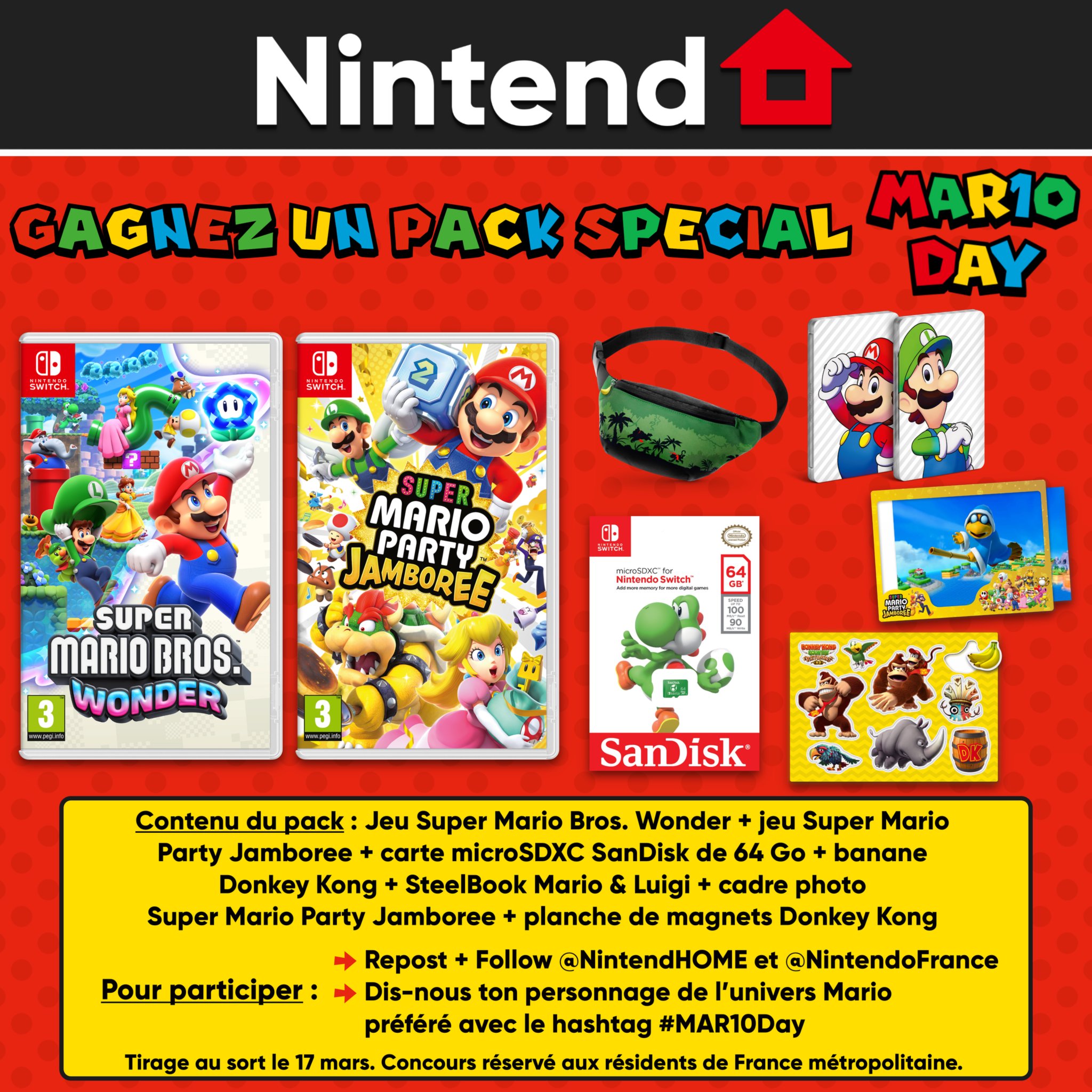 🎁 Concours – Pour fêter le MAR10 Day, tentez de gagner un pack spécial avec deux jeux et des goodies dédiés à votre plombier préféré ! Pour participer : 🔄 RT + Follow @NintendHOME et @NintendoFrance #️⃣ Dis-nous quel est ton perso Mario préféré avec #MAR10Day 📅 Tirage le 17/03