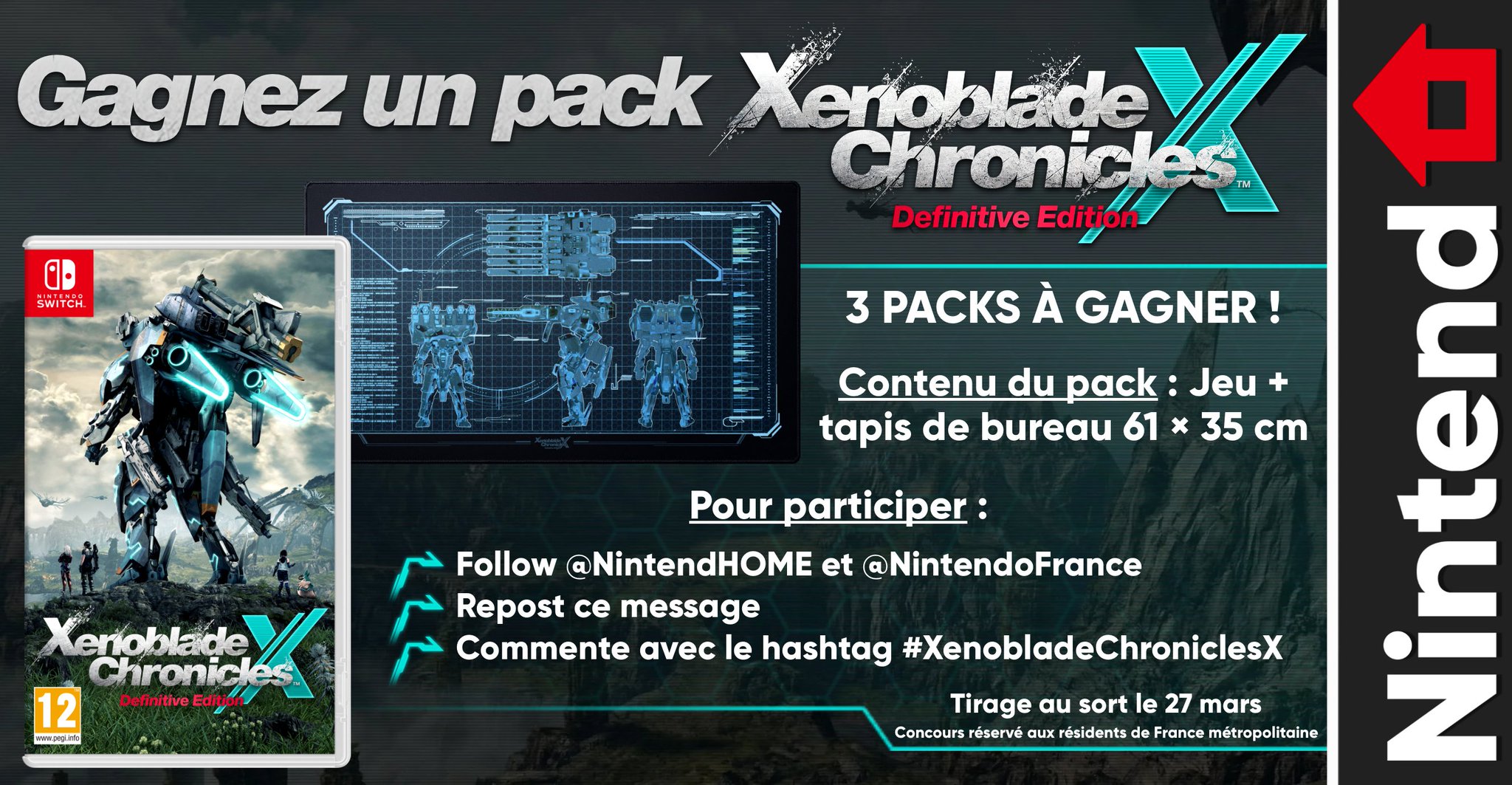 🎁 Concours – Tentez de gagner un pack Xenoblade Chronicles X: Definitive Edition et partez explorer la planète Mira ! Pour participer : 🔄 Repost et Follow @NintendHOME et @NintendoFrance #️⃣ Commente avec le hashtag #XenobladeChroniclesX 📅 Tirage au sort le 27/03 (3 gagnants)