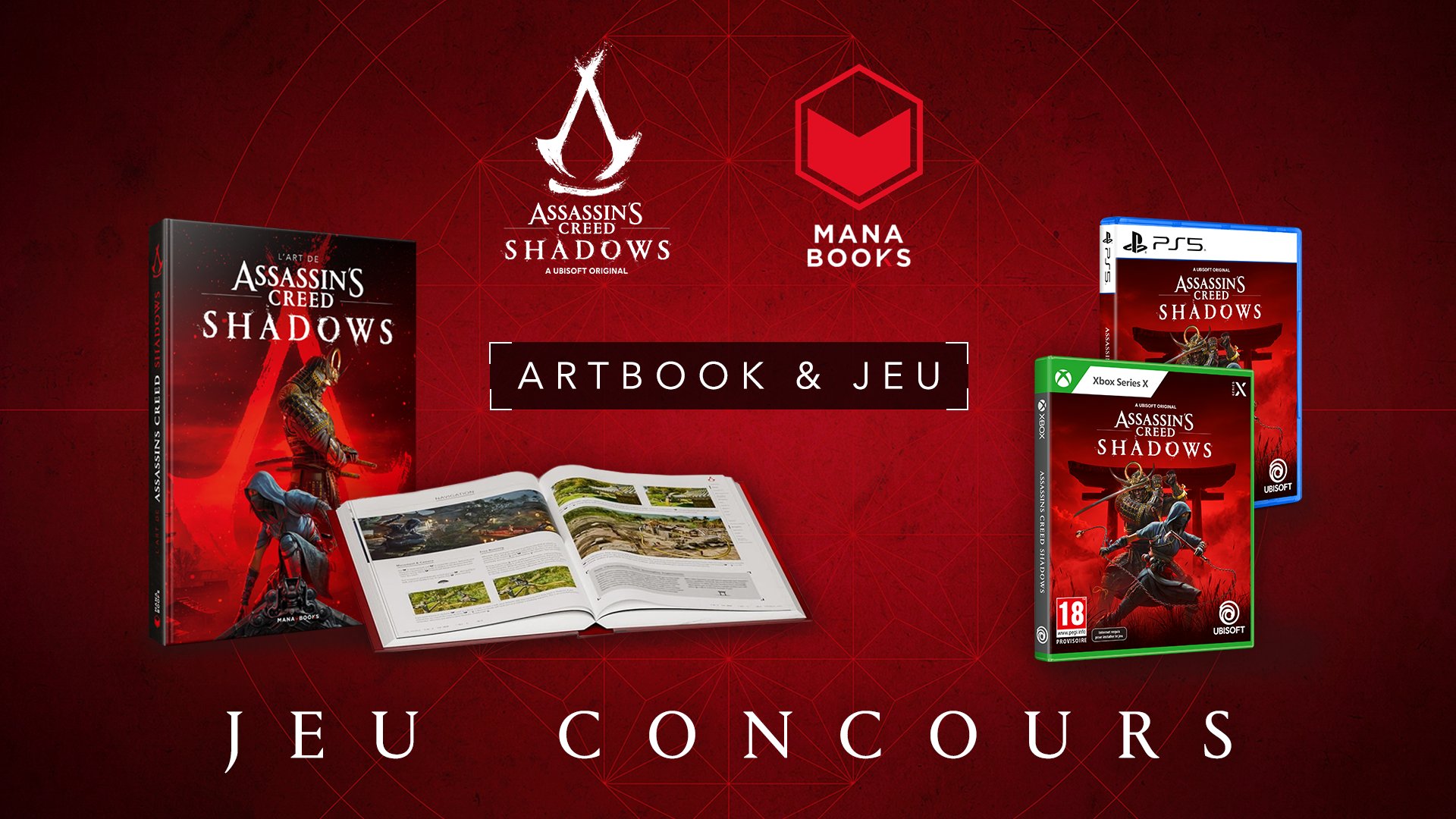 JEU CONCOURS - ARTBOOK + JEU 📕🎮 Tentez de remporter ce superbe lot avec l’artbook officiel d’Assassin’s Creed Shadows et le jeu en Édition Standard (PS5 ou Xbox Series X) ! ❤️ Liker le post 💬 Commenter avec l’emoji 📚 ✅ S’abonner à @AssassinsFR et @Mana_Books_