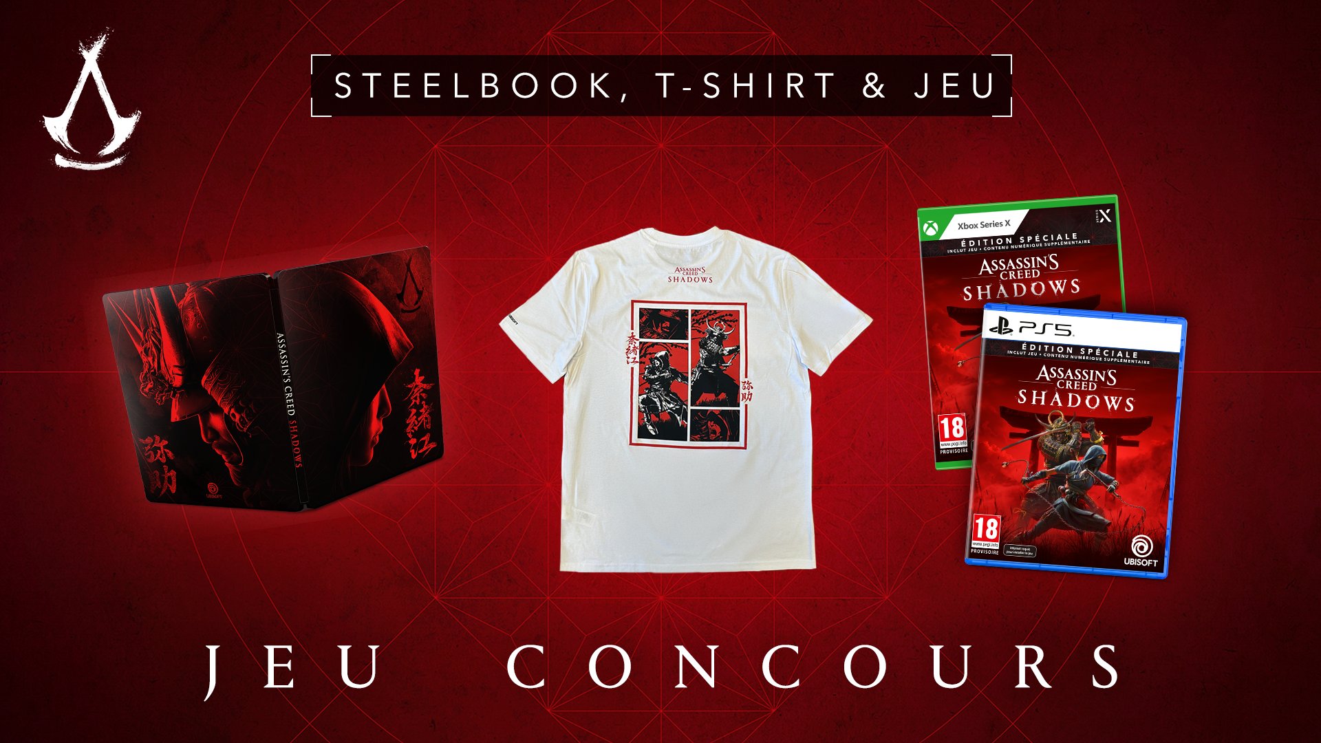 JEU CONCOURS - GOODIES + JEU 🎁 Tentez de gagner un lot composé d'un t-shirt, d'un steelbook et d'un jeu Assassin's Creed Shadows (Standard) ! ✨ ❤️ Liker le post 💬 Commenter avec votre plateforme de jeu (Xbox Series X ou PS5) ✅ S’abonner à @AssassinsFR et @UbisoftFR