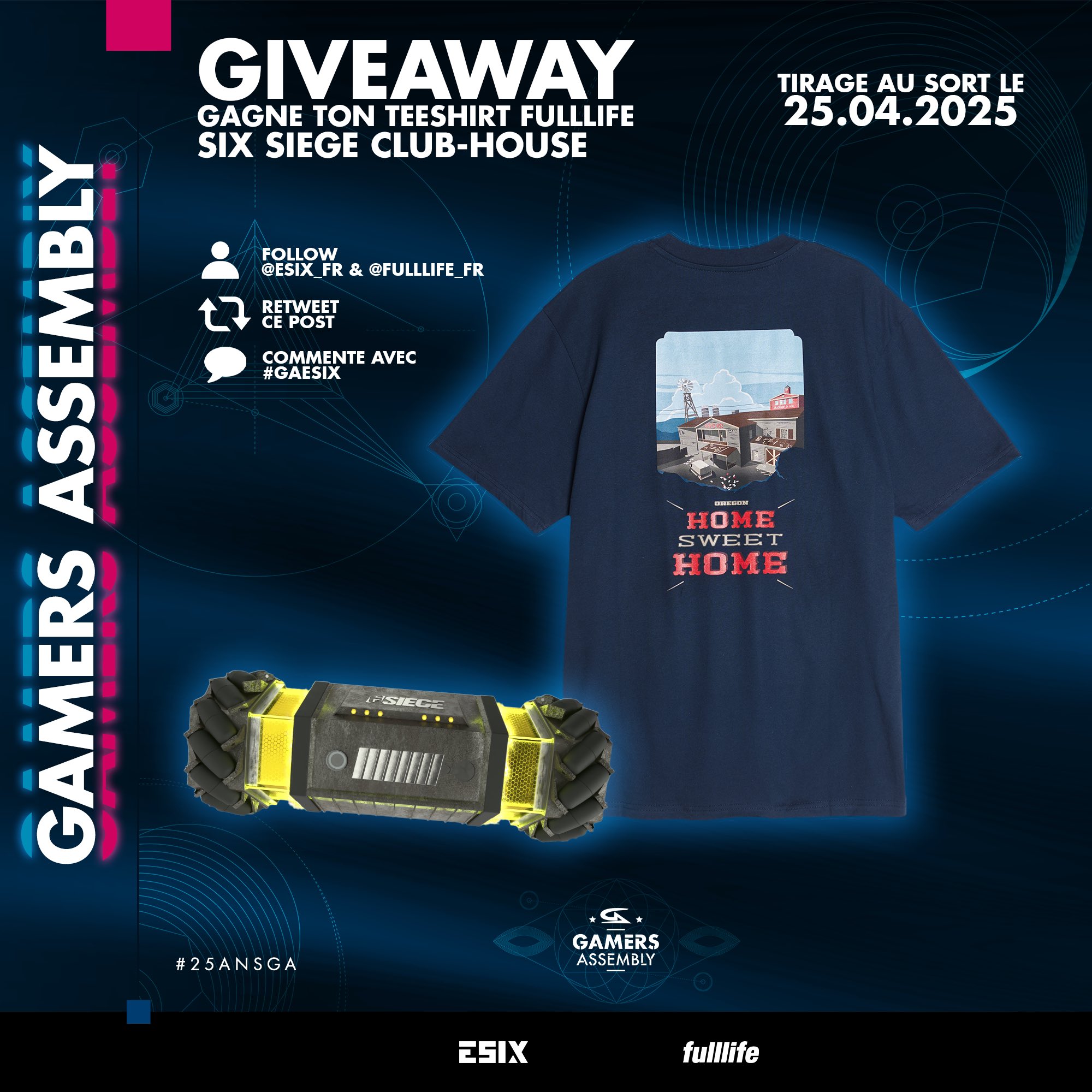 La Grande Finale de la @GamersAssembly c'est dans quelques instants et comme l’an dernier, @Fulllife_fr t'offre un t-shirt Six Siege Oregon ! 😍 #25ANSGA ✅ Follow @ESIX_FR & @Fulllife_fr 🔁 Retweet 🗨️ Commente avec #GAESIX ⚠️ TAS le 25/04 à 12h