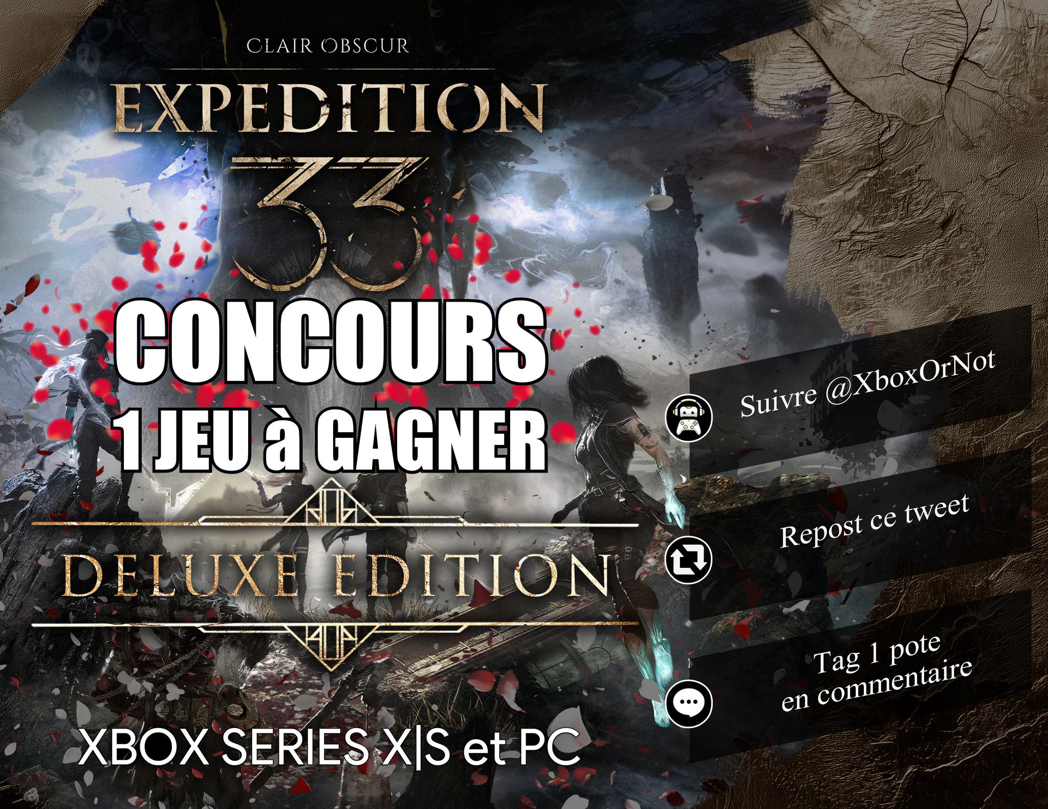 Nouveau concours 🎁 Tentez de gagner 1 Jeu ✨ Clair Obscur: Expedition 33 Deluxe Edition ✨ Jouable sur Xbox Series X|S et PC 🥰 👉 Suivre @XboxOrNot 🔁 Repost ce tweet 💬 Tag 1 pote en commentaire #Concours #ClairObscurExpedition33 #Expedition33 #XboxSeriesX #PC TAS 04/05