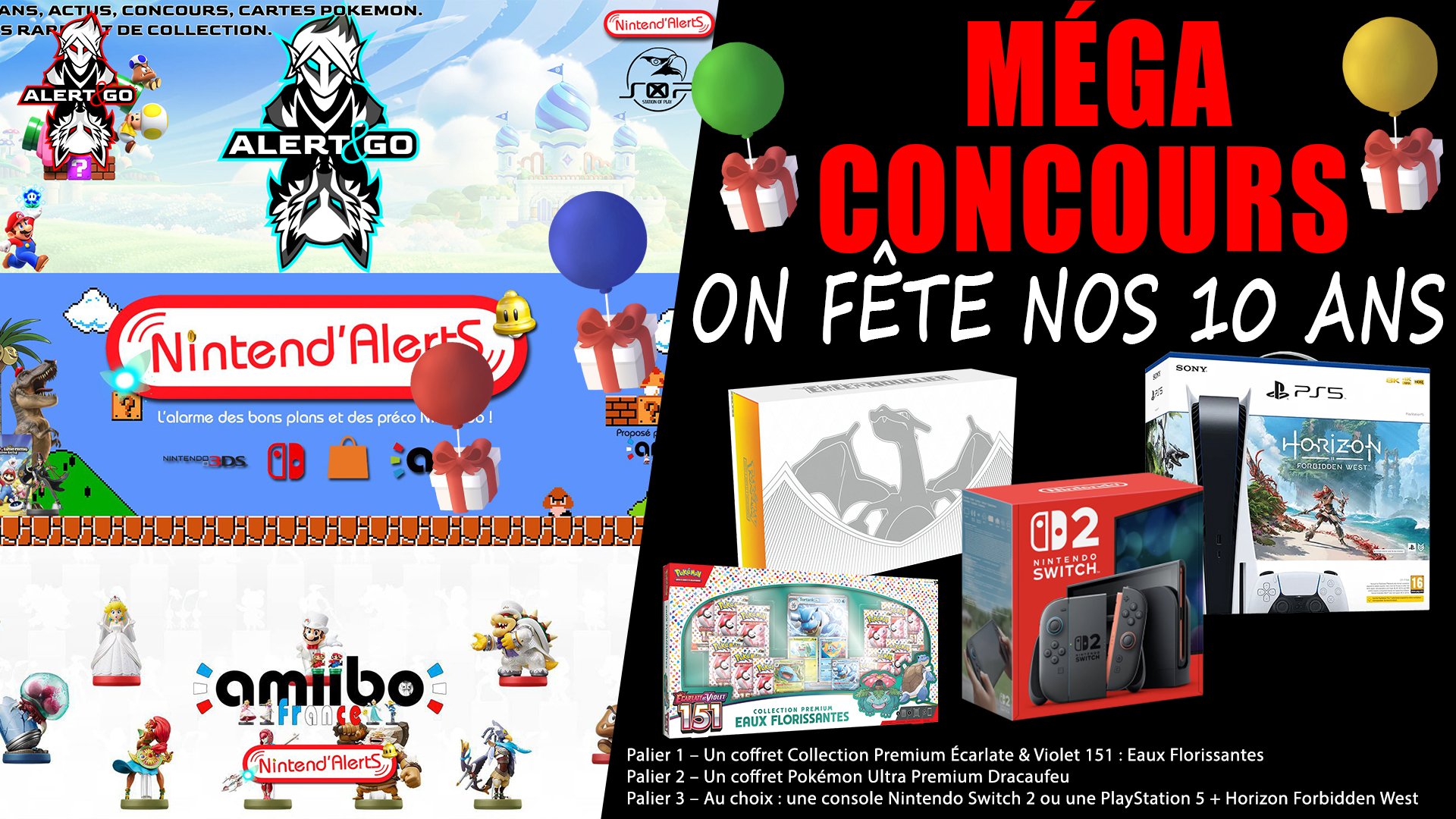 🎁Méga Concours pour célébrer notre anniversaire gagne console Switch 2, une PS5, un coffret Ultimate Dracaufeu, un coffret Eaux Florissantes ➡️Follow @AlertEtGo ➡️RT ce tweet ➡️Commente avec #AlertEtGoAnniversaire 1er palier 2k RT:Eaux florissantes 2ème palier 4k RT:Ultra
