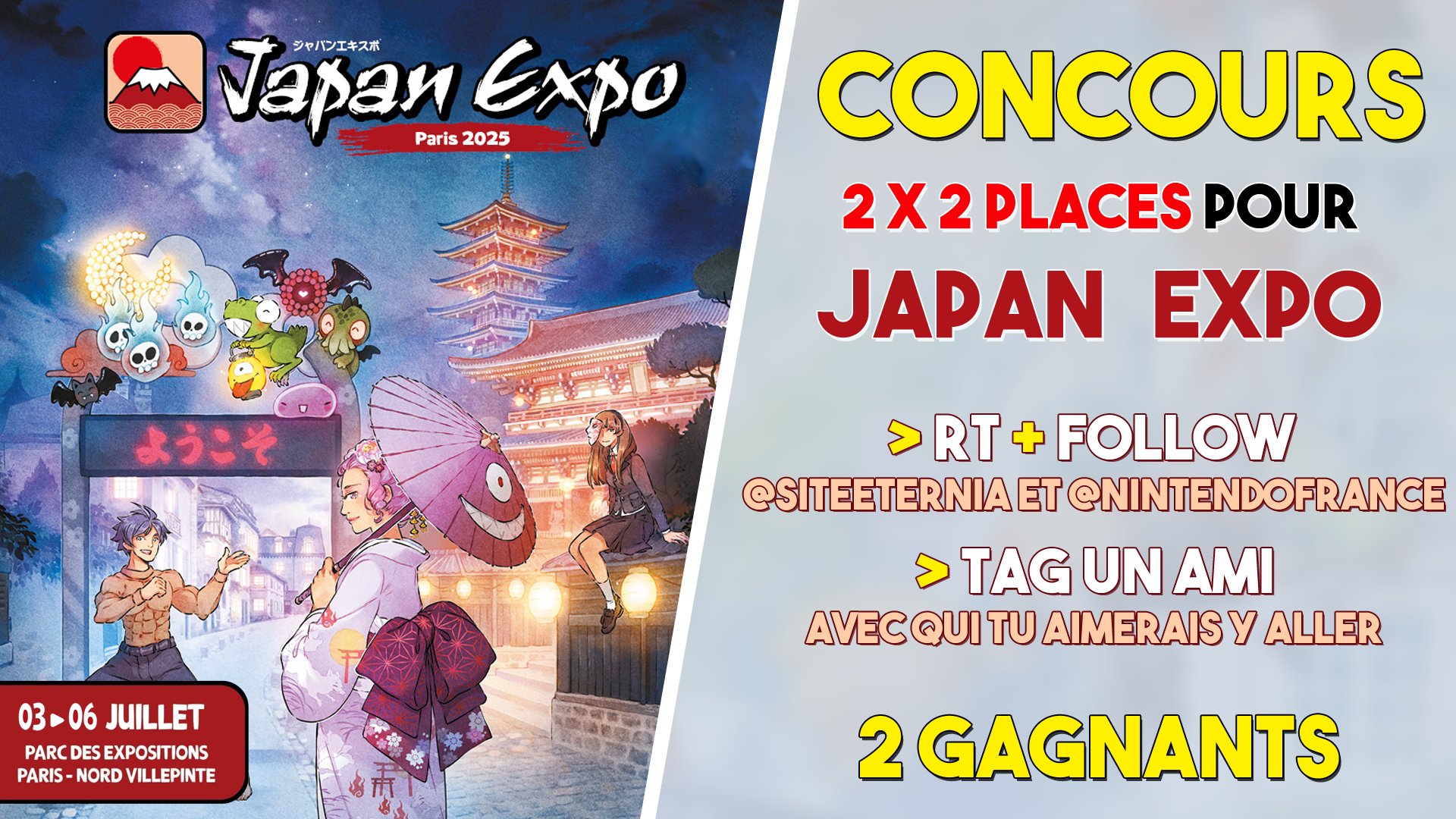 #Concours🎁 2×2 places à gagner pour @japanexpo, 1 pour toi, 1 pour un ami ! 👉 RT + Follow @SiteEternia et @NintendoFrance 👉 TAG un ami en COMMENTAIRE avec #NintendoJapanExpo 🏆 TaS le 25 juin à 18h00. DEUX GAGNANTS ! #NintendoJapanExpo du 3 au 6 juillet 2025 ⛩🇯🇵🇫🇷
