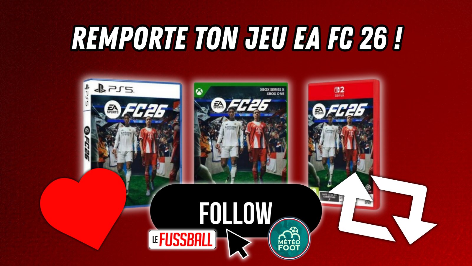 🚨 CONCOURS FC26 🚨 Grâce à @LeFussballMedia REMPORTE TON JEU FC26 sur la console de ton choix ! ➡️ Follow @LeFussballMedia et @MeteoFootMaps ♥️ Like ce post 🔄 RT ce post ✍️ Commente pour dire sur quelle console tu le veux ! 🍀 Tirage au sort le 03.08.25 ! Bonne chance !