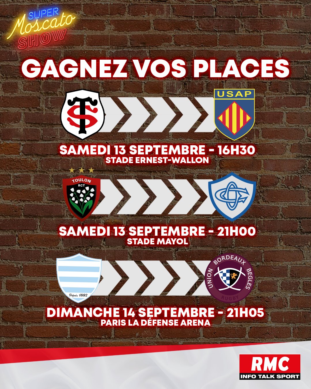 💪🎁 Jeu concours pour vous les types ! 🏉 Le SMS t'offre tes places pour le match de Top 14 de ton choix parmi les trois proposés. 📲 Pour participer, RT + follow @Moscato_Show, et dis-nous en commentaire le match auquel tu souhaites assister.