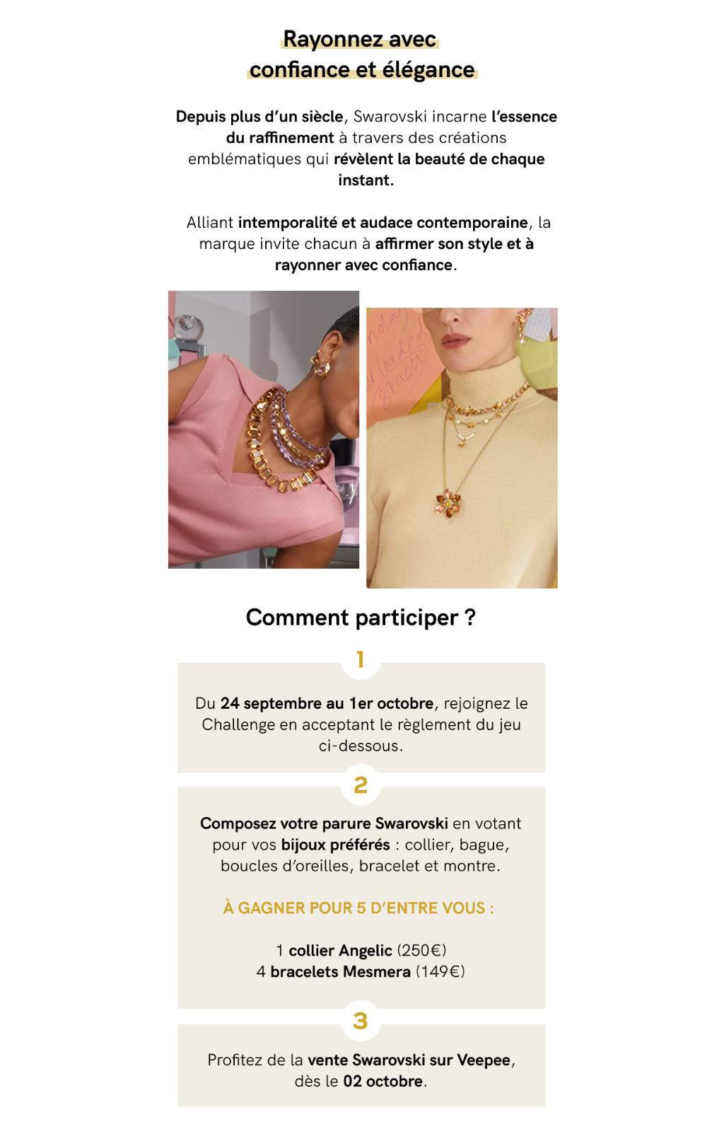 Jeu Veepee n°438452 pour gagner 1 collier “Angelic” Swarovski (250 euros) , 4 bracelets “Mesmera” Swarovski (149 euros)