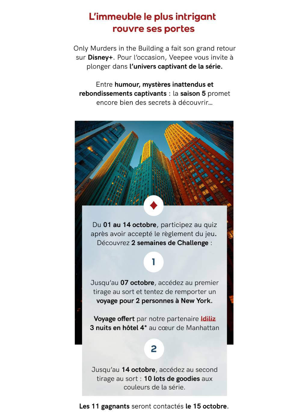 • 1 voyage à New York pour 2 personnes avec une visite guidée "Only Murder in the building" valeur 3 000 €