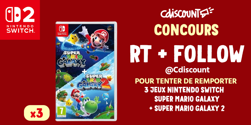 🎁 Concours 🪐 Vous voulez tester Super Mario Galaxy 1 et 2 sur Nintendo Switch ? 😙 Alors on vous fait gagner 3 jeux !! Pour tenter votre chance : ✔️ RT + FOLLOW @Cdiscount 🍀 TAS le 9/10