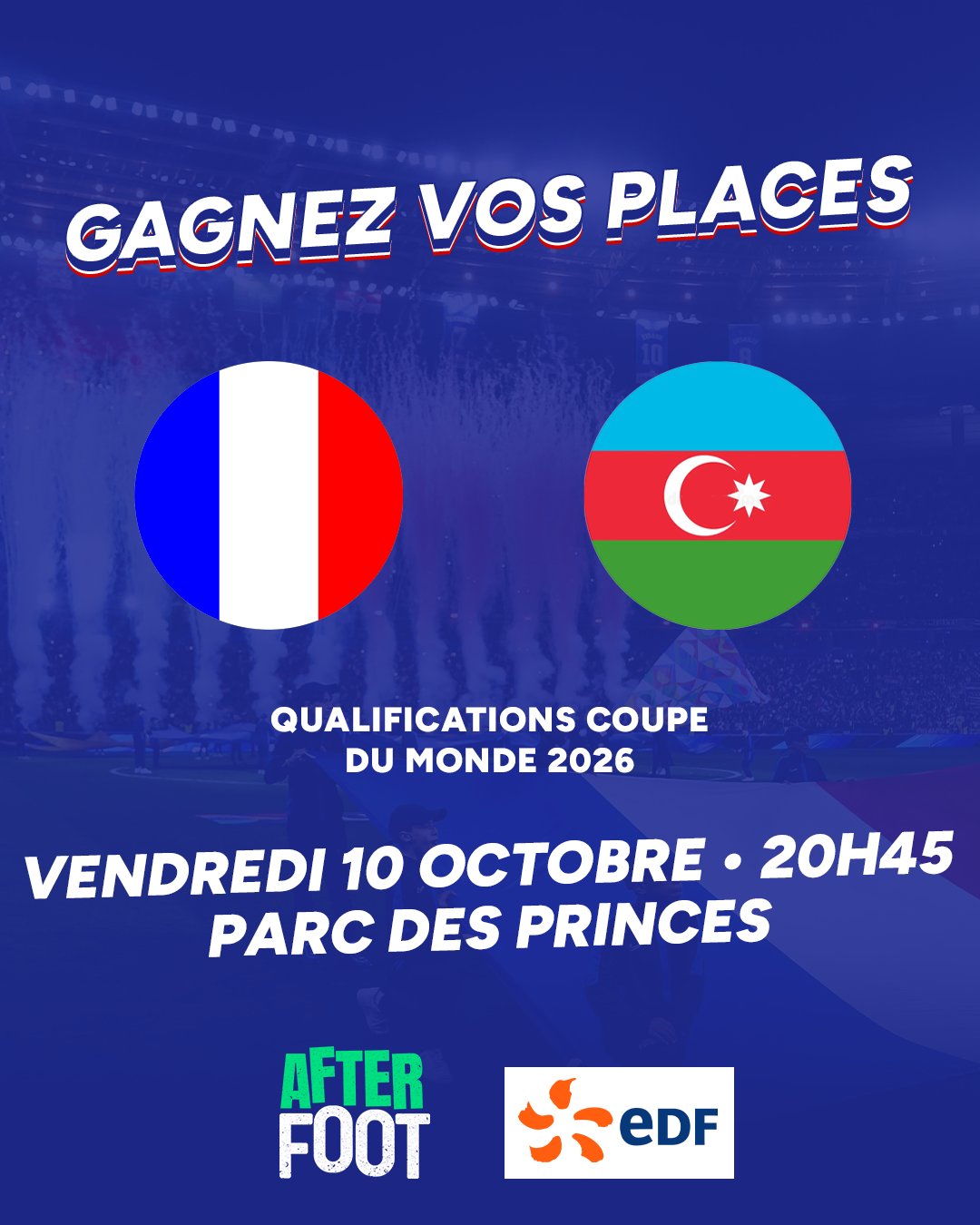🎁 JEU CONCOURS 🎟️ Remportez vos places pour le match de l'Équipe de France contre l'Azerbaïdjan, vendredi 10 octobre à 20h45 au Parc des Princes. 🍀 Pour participer, RT + Follow @AfterRMC et commente ton prono. Avec @EDFofficiel