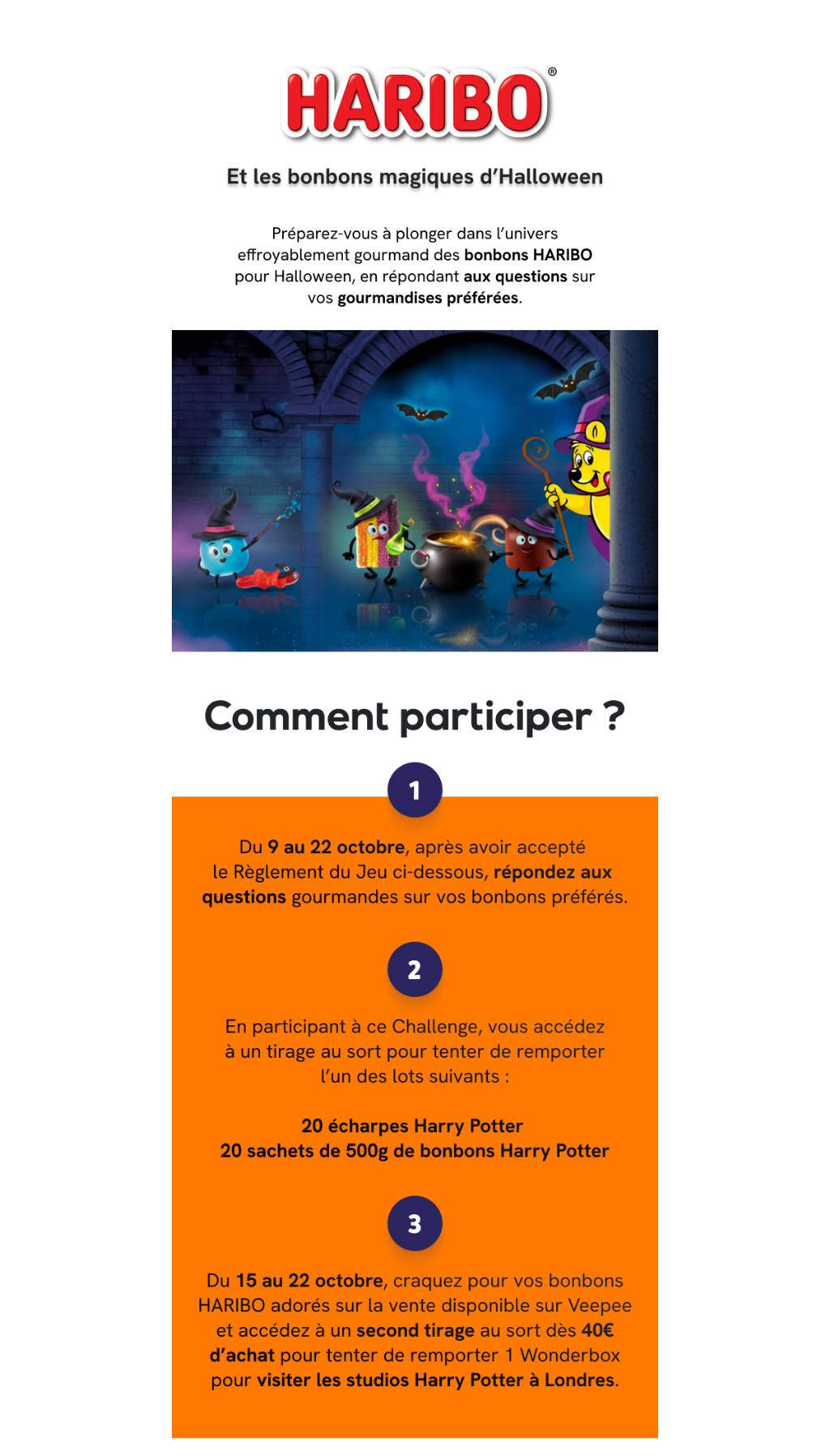 Jeu Veepee n°439642 pour gagner 1 coffret Wonderbox Séjour et visite des studios Harry Potter à Londres (499 euros) , 20 écharpes Harry Potter , 20 paquets de 500g de bonbons