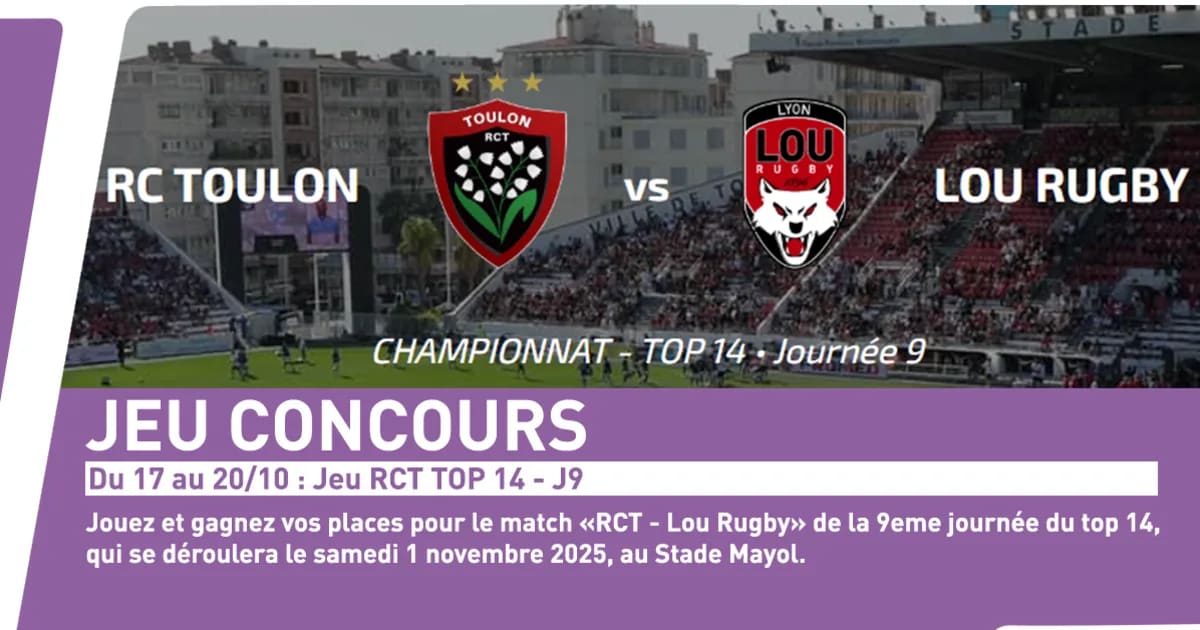 Du 17 au 20 octobre 2025 inclus, le réseau Mistral organise un jeu concours, en partenariat avec le RCT - Rugby Club Toulonnais.Tentez de remporter une invitation pour 2 personnes pour le match du Rugby Club Toulonnais face au Lou Rugby, le samedi 1er novembre 2025 au Stade Mayol pour le compte de