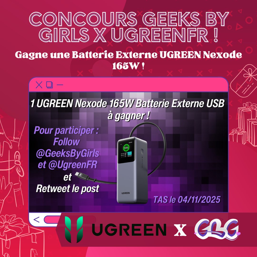 📢 ALERTE #CONCOURS ! 📢 On vous fait gagner une #BatterieExterne #UGREEN Nexode 165W ✨ Pour participer : 🔁 RT ce tweet ✅ Follow @GeeksByGirls & @UgreenFR 📆 TAS le 4/11 Bonne chance 💜 ❤ GO ! #Giveaway #Tech #Chargeur #PowerBank #Geek #Gadget #Gaming #GamingNews #GBG
