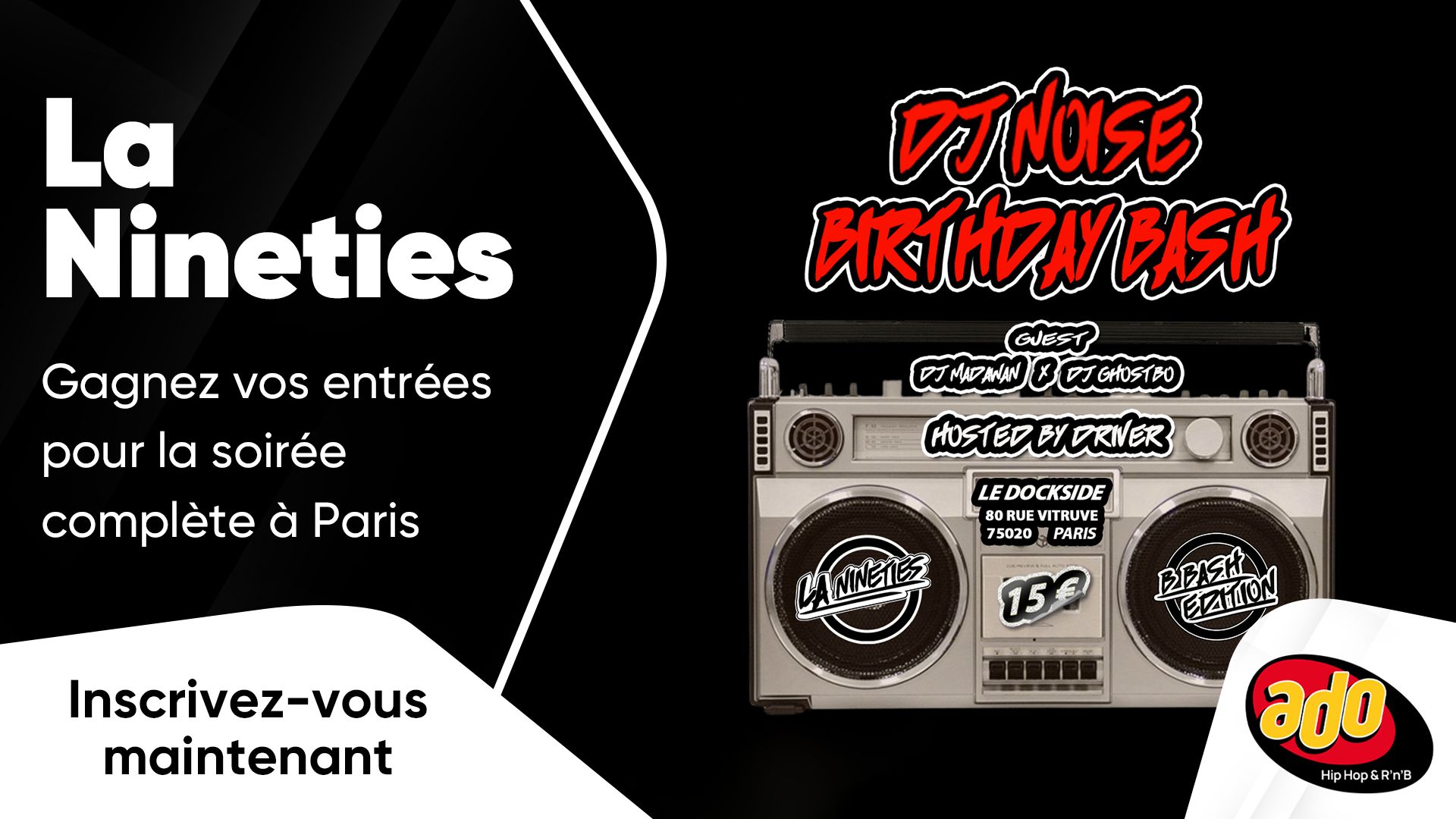 Cette semaine sur Ado, tentez de gagner vos places pour la soirée complète « La Nineties » à Paris le 21 novembre : karaoké, film, et soirée avec DJ Noise et des guests !