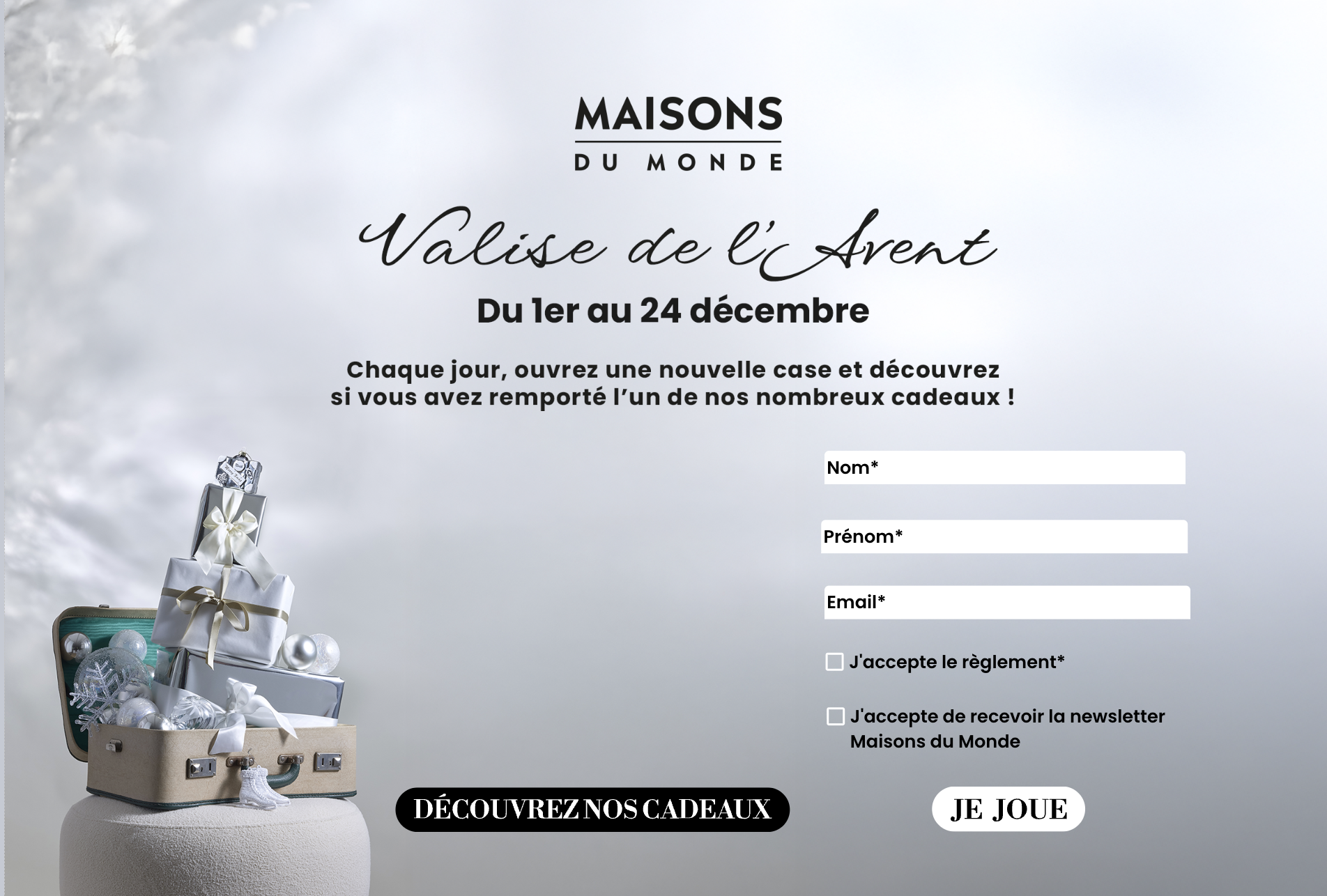 Calendrier de l'Avent. Laissez vos coordonnées + Instants Gagnants. Vous pouvez rejouer tous les jours.