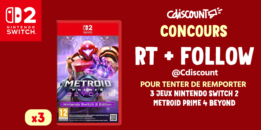🎁 Concours 🚀 Prêt(e) à plonger dans les profondeurs galactiques ? 🔫 Tentez de gagner Metroid Prime 4: Beyond sur Nintendo Switch 2 👉 https://t.co/ERWkXbnFny 🌌 3 jeux à remporter ✔️ RT + FOLLOW @Cdiscount 🍀 TAS le 10/12