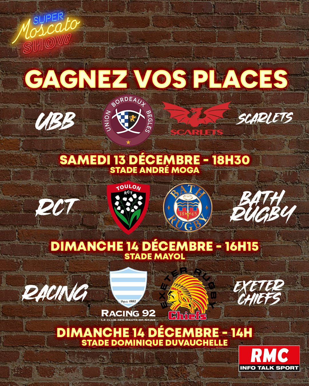 Jeu Super Moscato Show n°446685 pour gagner Des invitations pour la 2e journée de la Coupe des Champions de rugby , Des invitations pour la 2e journée de la Challengecup de rugby