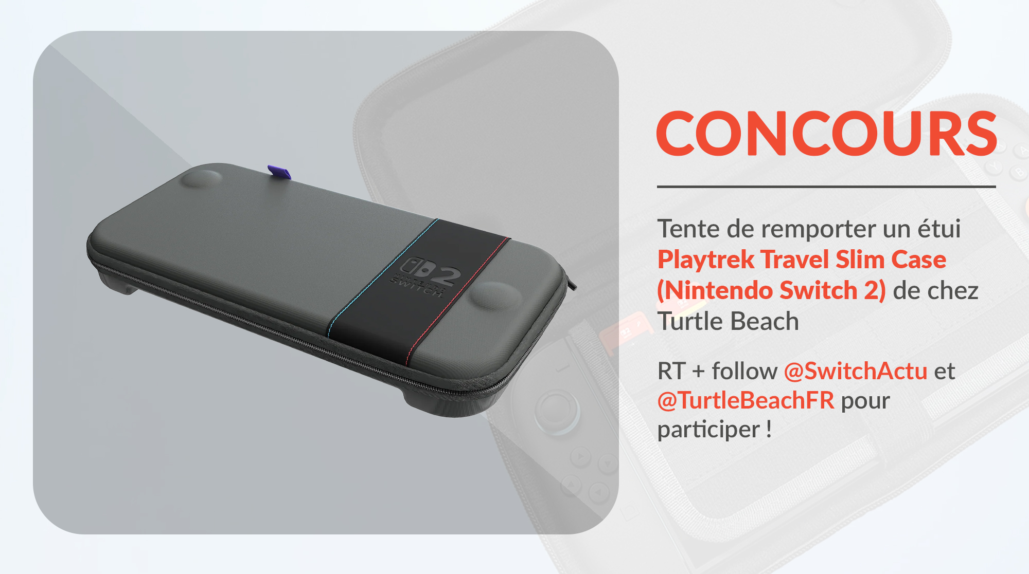 #CONCOURS - Tente de remporter un étui Playtrek Travel Slim Case de chez Turtle Beach, pour Nintendo Switch 2 ! Pour participer : 🔁 RT ce tweet 👉 FOLLOW @SwitchActu et @TurtleBeachFR --------- 🇫🇷 Réservé à la France Métropolitaine ⚠️ Une personne tirée au sort ⏳ Tirage au