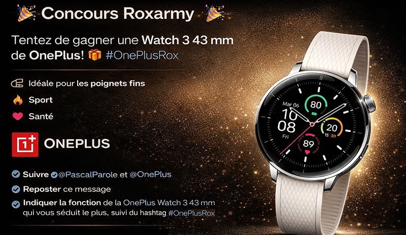 Pour ouvrir le bal des concours célébrant les 16 ans de Roxarmy, une montre OnePlus Watch 3 43 mm est à gagner. Epurée, elle  convient aussi bien en tant