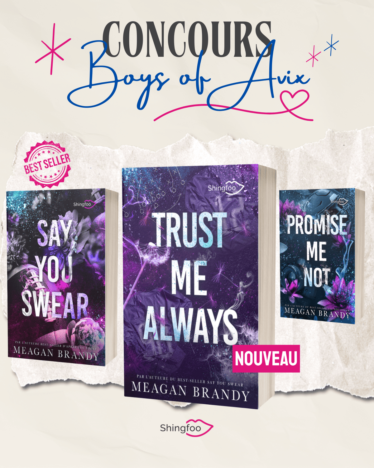 [CONCOURS EXCEPTIONNEL] Boys of Avix Sortie événement Après Say you Swear et Promise me not, le troisième tome de la saga phénomène de Meagan Brandy sort dans 2 semaines. Booknode est partenaire de la sortie et vous permet de gagner plusieurs lots exceptionnels composés des trois