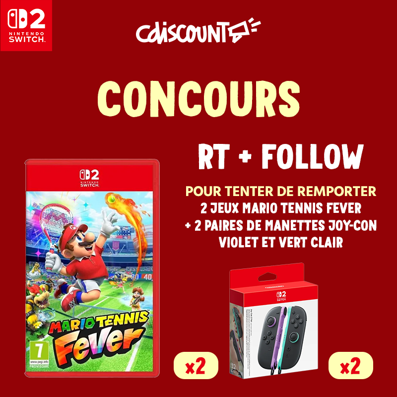 🎁 Concours 🔥 À vos raquettes ! Mario et sa bande entrent sur le court pour des matchs survitaminés sur Nintendo Switch 2 🎾 Tentez de gagner 2 jeux Mario Tennis Fever + 2 paires de manettes Joy-Con 👉 https://t.co/yDlG49lBhu ✔️ RT + FOLLOW @Cdiscount 🍀 TAS le 22/02
