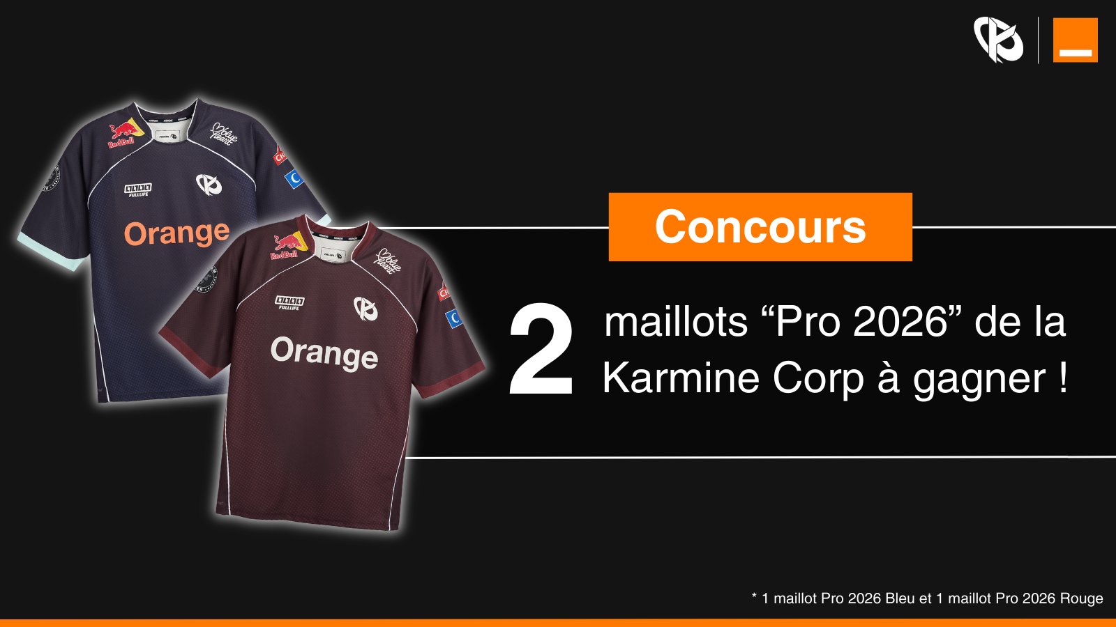 [CONCOURS] Les playoffs démarrent très fort et on vous offre 2 maillots Pro 2026 pour supporter la @KarmineCorp comme il se doit 🧡 Pour participer : 🔁 RT ce tweet ✅ Follow @RushEsport et @KarmineCorp TAS le 20/02/2026 Bonne chance 🍀