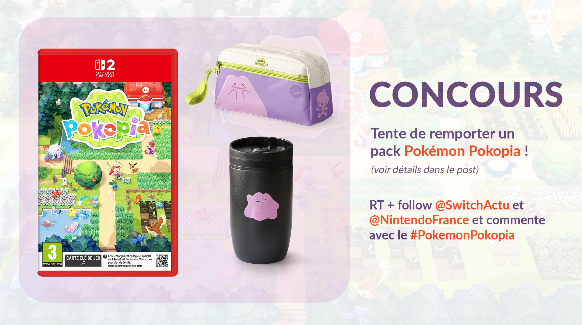 Jeu Switch-Actu n°456350 pour gagner 1 lot composé de 1 jeu vidéo Pokémon Pokopia sur Switch 2 + 1 trousse de voyage + 1 mug