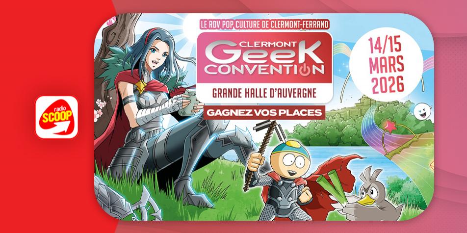 Cette semaine, Radio SCOOP vous offre vos entrées pour la Clermont Geek Convention à la Grande Halle d’Auvergne, samedi 14 et dimanche 15 mars 2026 de 10h à 19h.