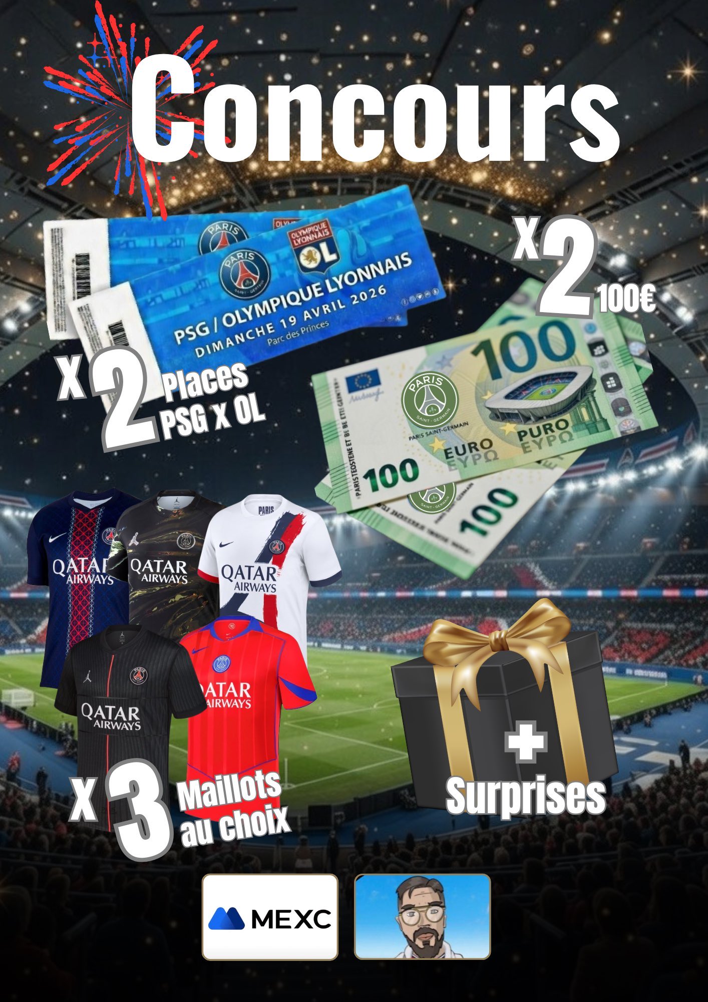 Hey la #TeamPSG ! On vous fait gagner +800€ de lots 🔴🔵: - 2 places pour PSG-OL au Parc des Princes, le 19 avril - 3 maillots du PSG au choix - 2 x 100€ - Et d’autres surprises… RT, Like et follow @Yayou_MEXC @MEXCFrancophone Mentionne 3 ami(e)s TAS 23/03/26 #Giveaway