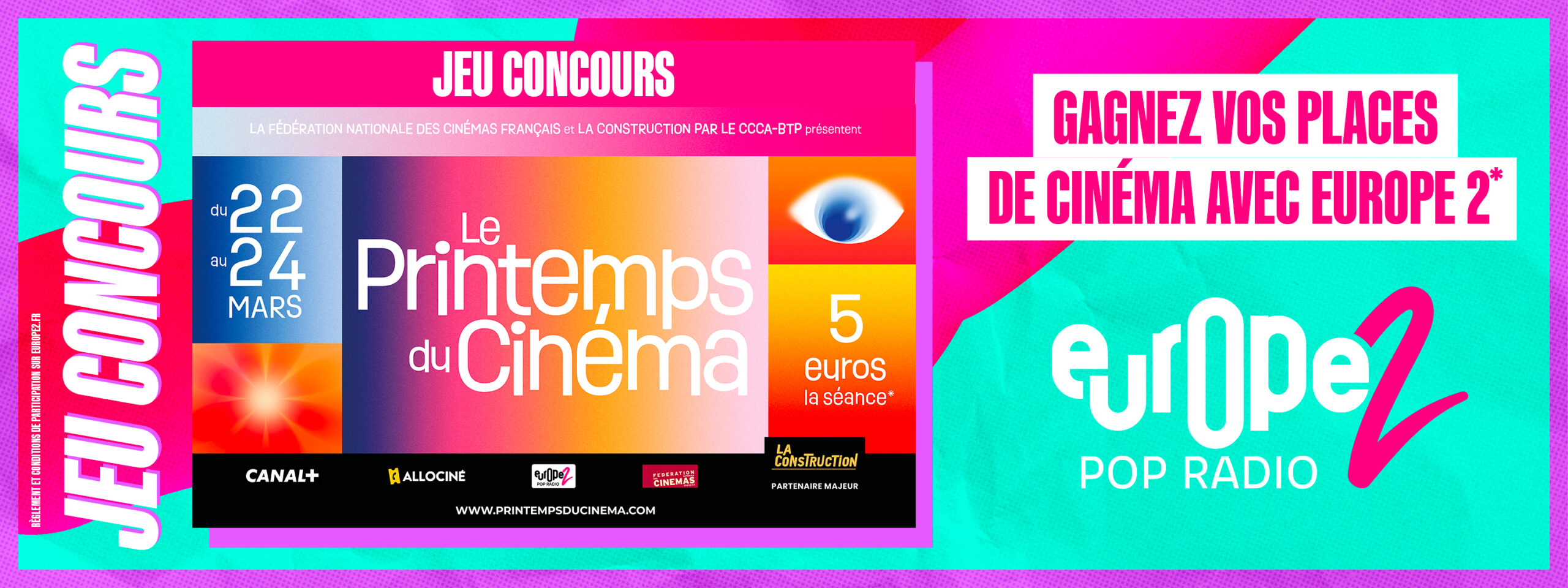 Tentez de gagner 4 places pour le Printemps du Cinéma du 22 au 24 mars. Profitez pleinement de cet événement cinéma avec Europe 2 !