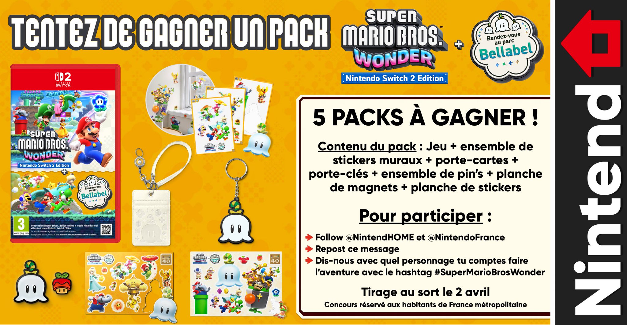 🎁 Concours – Tentez de gagner un pack Super Mario Bros. Wonder – Nintendo Switch 2 Edition + Rendez-vous au parc Bellabel ! 🔄 RT + Follow @NintendHOME et @NintendoFrance #️⃣ Dis-nous quel personnage tu vas jouer avec le hashtag #SuperMarioBrosWonder 📅 Tirage 02/04 (5 gagnants)